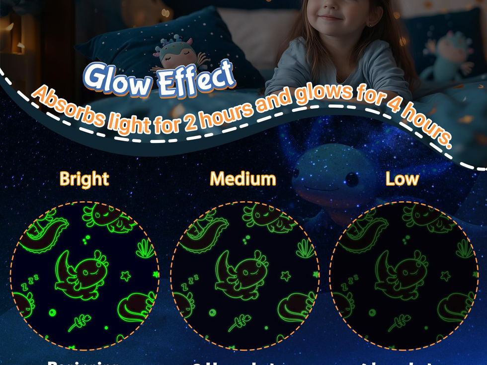 1.Absorb Light and Glowing: Expose the bed blanket to sunlight or a bright light source for 20 minutes, then the stuffing blanket can glow for 2+ hours. The brighter the light, the stronger it glows. Environmentally friendly and practical bedding accessories for room couch decorations. 2.Unique Glow-in-the-dark Gifts: Glow in the dark blankets and toys can light up the cute salamander animal at night. It will be the best gift ideas for Birthdays, Christmas, Easter, New Year, Thanksgiving Day and great supplies for travel, camping, picnics. 3.Size for all ages child: Cute softness blankets, 50 x 60 inches, fit all ages children, including baby, 2-10 years old, tween, preteen, even adult. It can be used in spring, summer, autumn, winter for warm and bedroom decor. 4.280 GSM Material:Boulou Axolotl Stuff is made of cozy plushy polyester fabric, which is comfortable and soft. 5.Machine Washable and Easy to Clean: The kids Axolotl blankets can be tumble dryer, machine washable, and dry cleanable without compromising luminous performance, and durable enough to not lose the luxurious soft comfort of the blanket even after months of use.
