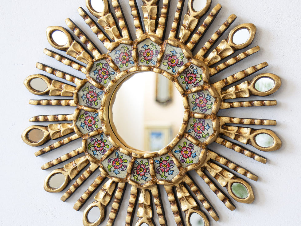 Handmade in Peru Style: Peruvian Reverse Hand-painted Glass Materials: Mohena Wood, MDF, Glass, silver leaf, gold leaf and mirror. Size: 11.8 "H x 11.8" W x 1.18 "D (Ø30 cm x 3 cm D) Ready to Hang!