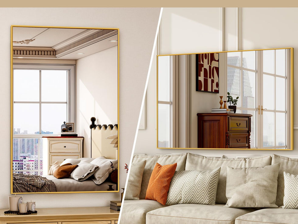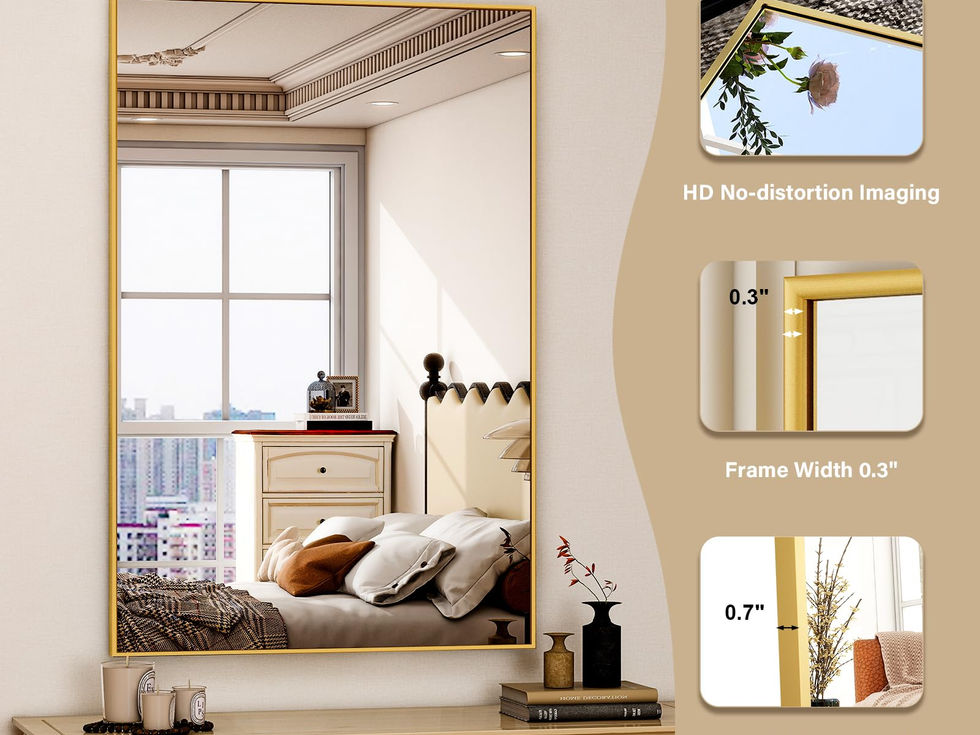 Right Angle Rectangle Bathroom Mirror : This top right angle bathroom mirror - the classic design of black and gold is more noble, fashionable and durable, black is calm, gold is luxurious, high-definition rectangle mirror is easy to see the skin details and increase the sense of space translucency, choose your favourite style for your warm home Aluminium Alloy Frame : Check out the practicality and elegance of our aluminium alloy frame bathroom vanity mirror! The aluminium alloy frame makes this bathroom wall mirror more than just a mirror, it is a piece of art that showcases your unique personal artistic taste. It can be used as wall mirrors for bathroom as well as a bedroom mirror, and its design style can add design and style to any room Explosion-Proof Glass : Our vanity bathroom mirror are made of durable blast glass for high-definition imaging and distortion-free reflections, and the latest blast-resistant design thoughtfully protects you and your family Unique Design : Our bathroom vanity with mirror has a unique top right angle design, the whole is rectangular, especially eye-catching, can be hung vertically or horizontally, highlighting the beauty of the mirror, suitable for home or office multi-scene Multiple Scene Applications : Our vanity mirror can be used as a standing mirror, wall mirror or tilting mirror. Suitable for daily use, widely used in bedroom, living room, wardrobe, home gym, corridor, behind the door and so on