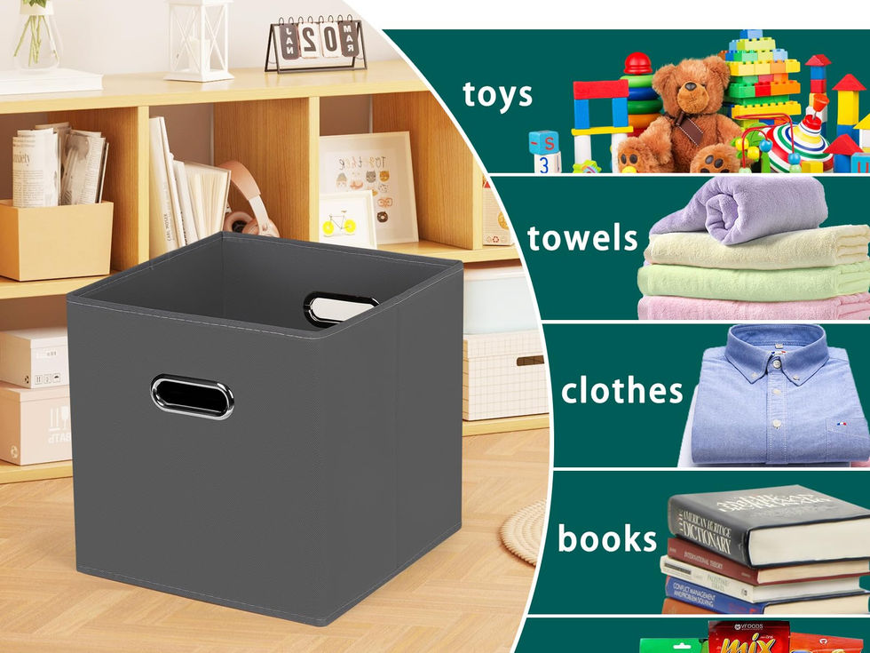 【2 Reinforced Handle Designs】The dual handle design makes this cube storage bin strong and easy to grasp,making it convenient for you to pull out the bins from the shelves.This cube storage organizer heavy cardboards added at the sides and bottom to make this storage bins rigid. 【Collapsible Storage Bins】The cube organizer bins is easy to assemble when in use,can be used as a drawer, and is easy to fold when not in use, does not occupy space,and is easy to carry.Ideal for cloth storage bins for organizing. 【Perfect Storage Plan】This storage cubes is specially designed for organizing your home.Can be used to bedroom organizing basket,Laundry storage box,child room toy organizers box,bathroom towel cube storage bin, toilet storage container,book/magazine organizer,holiday ornaments storage cubes,living room storage,and many other uses. 【Multi-Purpose Storage】cube storage bins measures 11x11x11",the perfect size for most cube organizers.This fabric storage bins is suitable for in the under the bed,storage compartment, or living room, bed room, car, toy room,sed in the laundry room,bathroom and office shelves,game room,closet,nursery, craft room, etc.This is the perfect choice to keep the space tidy and organized. 【High-Quality Materials】The storage box of the cube organizer is made of non-woven fabric,Non woven fabric is soft,breathable and non irritating,And it's environmentally friendly.Fabric storage cubes basket can not only store items,but also add color and fashion to your home or other places,Minimalist design and neutral exterior fabric can be integrated into all decorations and styles of the house.