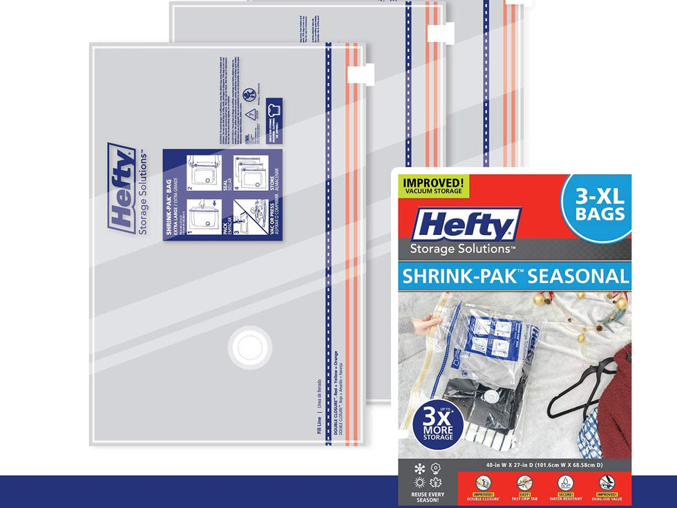 Space Saving Storage Solution: Hefty SHRINK-PAK vacuum storage bags are the perfect storage solution for seasonal clothing and bedding, offering maximum shrinkage and effectively saving space in your closet, suitcase or under your bed 3 XL Bags: Each XL bag is perfect for storing 2 standard pillows or a queen comforter Easy to Use: These bags feature an intuitive closure system that creates an easy air-tight seal, just Pack, Seal, Vac (or Press) and Store Long Lasting & Reusable: These durable storage bags can be used repeatedly, making them an effective eco-friendly solution to manage space and storage in your home Ideal for Home Storage, Travel or Moving: These vacuum storage bags are perfect for storing a variety of items, from your winter coats and clothing to your favorite comforters, pillows, bedding blankets, towels and more