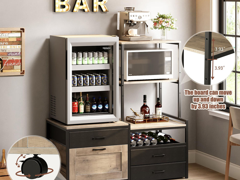 Reduce strain on the waist - This mini fridge stand raises the fridge to a more accessible height, greatly reducing pressure on the back and waist. It’s especially suitable for seniors or households with frequent use. It ensures comfort and safety, making your kitchen or office space more convenient and easier to access. Superb Storage Functionality - The mini fridge cabinet comes with multiple storage features. On the left side, there is a fabric drawer and a large wooden drawer with wheels at the bottom, which can be easily pulled out for storing various everyday items. On the right side, there are two fabric drawers and a wine rack that can hold up to 14 bottles of wine, perfectly balancing storage and decorative functionality. Adjustable Space - Mini Fridge Stand Compatible with Different Small Appliances. The top right side features three adjustable shelves, ideal for placing kitchen appliances such as a coffee machine or microwave. The middle shelf can be adjusted vertically within a 3.93-inch range, making it easy to accommodate small appliances of various sizes, meeting diverse storage needs with great flexibility. Sturdy structure - This mini refrigerator stand is made of high-quality medium-density fiberboard and a durable metal frame, with a maximum weight capacity of 220 lbs. It provides a stable and secure base for mini refrigerators and other kitchen appliances. Whether you place a refrigerator full of food or other heavy items on it, this stand ensures outstanding stability and safety without affecting its performance. Built-in Power Outlet - this refrigerator stand features a built-in 4-AC power outlet on the right side. You can easily plug in your mini refrigerator, coffee maker, microwave, or other small appliances without the need for extra extension cords, making it a truly efficient and practical addition to your kitchen or office space.