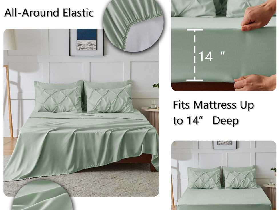 Pinch Pleat Design:The eye catching design is very sophisticated and low maintenance,The Color is vibrant and pinch pleat design is both elegant and modern What You Can Get: Queen Size bed in a bag includes 1 Comforter 88"x88", 2 Pillow Shams 20"x26", 1 Flat Sheet 90"x102" , 1 Fitted Sheet 60"x80"+14" and 2 Pillowcase 20"x30" OEKO TEX 100:We're proud to be certified by OEKOTEX when it comes to sustainability, ethical manufacturing and safety. Our Story:We take care of our home, it takes care of us HIMEET is an online-only, direct-to-consumer brand focused on creating quality bedding that make you feel at home