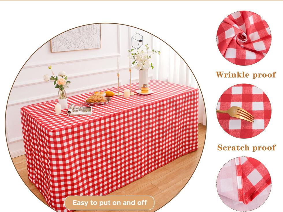 Each package contains 2 pieces of fitted table clothes. Color fade resistant tablecloths. Featured premium and durable polyester fabric, these rectangle checkered tablecloths are made to resist stains and wrinkles. These decorative and practical table covers can be reused after washing. The taut, fitted shape easily conceals unattractive table legs, extra supplies, power cords, or other items stored underneath. Ideal for 48L x 24W x 30H / 72L x 30W x 30H / 96L x 30W x 30H inches rectangular tables and 34L x 34W x 30H square tables. Buffalo plaid design instantly transforms an unsightly banquet or folding table into a highly chic presentation for any event. Great for outdoor picnic, banquet, trade shows, crafts show, vendor events, baby shower, BBQ and more. Machine washable in cold water. Gentle cycle if needed. No bleach. Tumble dry with low temperature.