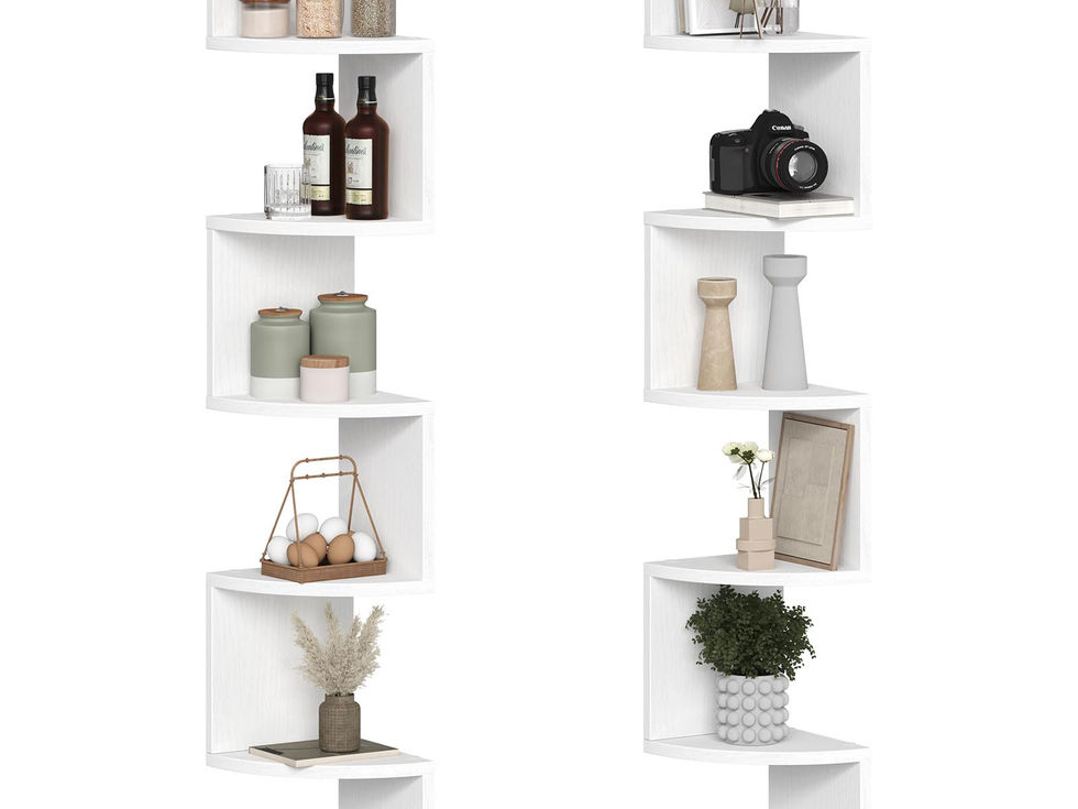 Versatile Duo for Flexible Configurations: This 2-piece corner shelf set for wall offers flexibility to suit your needs. Whether it's for display in your living room, bedroom or for storage in your study, this floating corner shelves creates a more organized space and enhances your lifestyle Modern Style with Functionality: This set of 2 floating corner shelves incorporates a zigzag design with curved shelves, exuding a strong modern charm. This corner shelf wall mounted is a decorative and practical storage solution that adds a unique touch to your living room or office Maximized Space for Easy Storage: Struggling with limited space at home? This set of 2 corner wall shelves is your savior! Its clever design maximizes wall space with 5-tier storage shelves, each spaced 7.9" apart, providing the perfect spots to neatly organize books, photos or decorative items Easy Cleaning with a Single Swipe: Concerned about dirt accumulation? The high-quality particleboard is smooth in finish and easy to clean. A light swipe with a slightly damp cloth removes dust and stains, keeping your corner shelf wall mounted set looking new Effortless Assembly with Clear Instructions: Worried about the assembly process? Relax! We provide a detailed guide and labeled components, making it effortless. No professional skills required. With a few steps, your 2-piece corner shelf will be ready for use. Suitable for solid walls only
