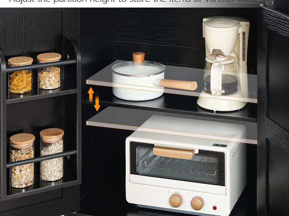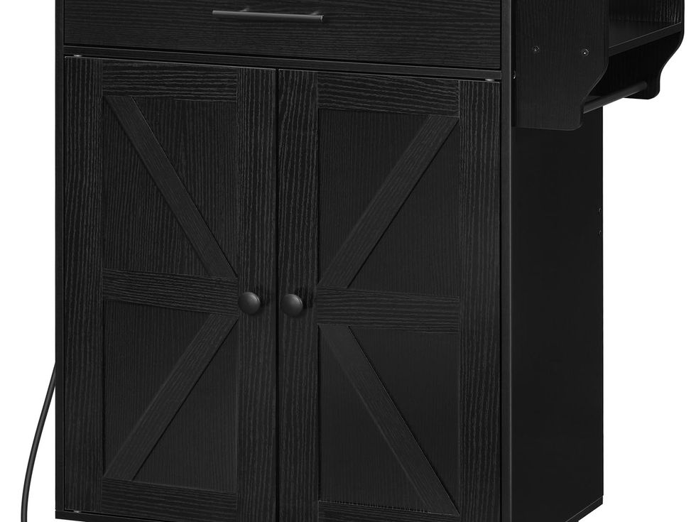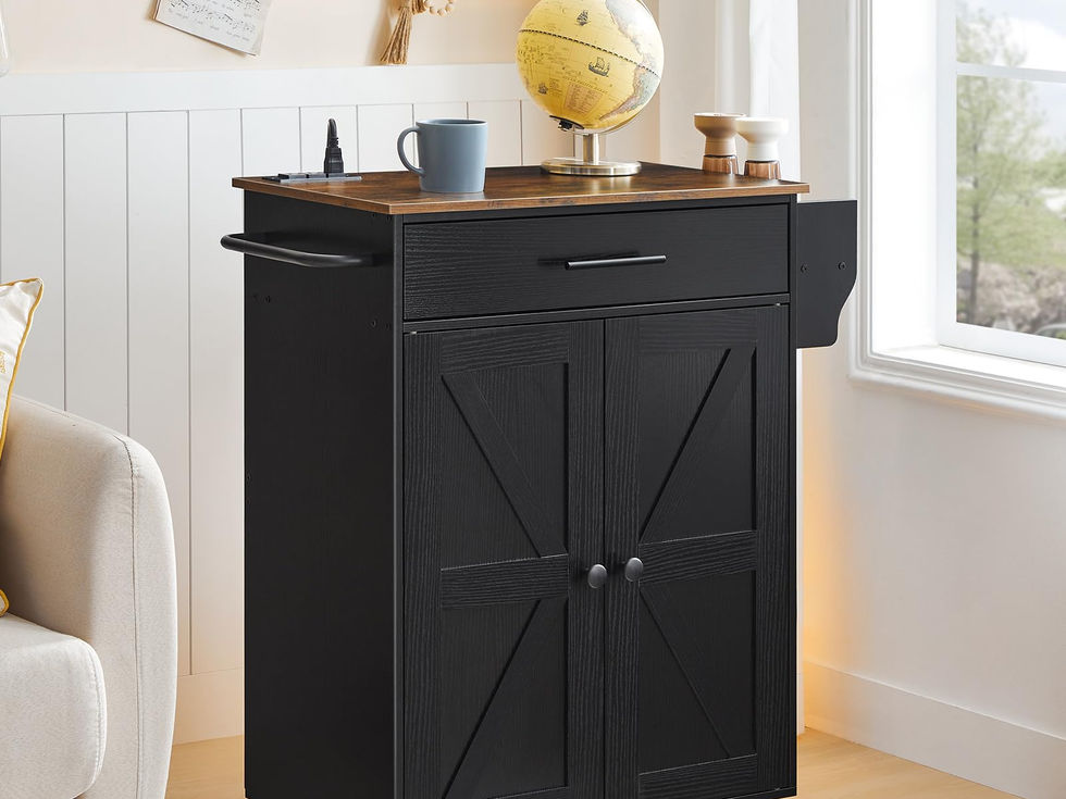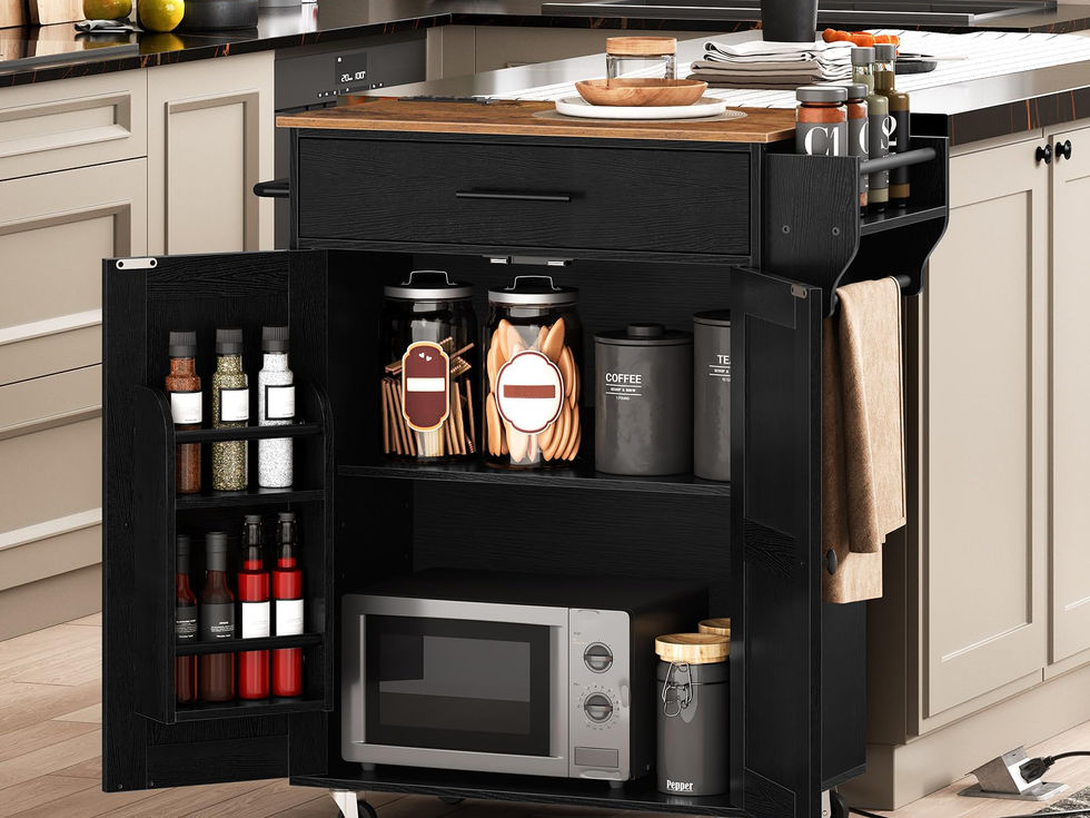 Capacious Storage: This kitchen island features an open countertop, a large drawer, a spice rack on the right, and a double-door cabinet below to store dishes, pots and pans, utensils, and spice bottles. The internal shelf can be adjusted to 3 heights Countertop with Power Supply: The kitchen island cart's countertop provides extra space for microwaves, baking ovens, etc. It is equipped with 3 standard sockets with a 1.5m power cord for added convenience when using various kitchen appliances Retro and Elegant Style: The black cabinet and a rustic brown countertop create a unique aesthetic that highlights the kitchen's warm style. Its functional partitions and ample storage space contribute to an exquisite lifestyle, perfect for daily meals Flexible Movement and Braking: Our rolling island cart for kitchen has four 360° rotating industrial wheels, 2 of which can be locked to keep the cart stationary. The diagonal assembly of two wheels with brakes ensures that the cart can be securely fixed in place Serviceable and Stable: Our kitchen island is made of selected particleboard, MDF and sturdy metal. Support slats beneath the top panel and 4 snaps on the corners of the back enhance the load-bearing capacity and stability. The top panel can support up to 110 lb
