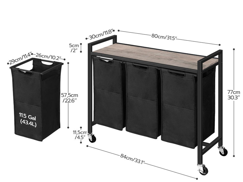 Efficient Divided Storage: With 3 spacious compartments, each holding up to 11.5 gallons (43.4L), this laundry sorter boasts a total capacity of 34.5 gallons (130L), so you can easily organize your laundry by type and separate the lights and darks Thoughtful Design: The laundry hamper basket is designed with three side pockets and a top shelf providing extra storage space for detergent or toiletries. Each liner is equipped with a bottom panel to prevent sagging.The hook-and-loop fastener allows for effortless pulling out and removing of the liners, making it convenient to transport them to the washing machine Easy to Transport: Equipped with 4 casters, this laundry sorter can be easily moved from the bedroom to the laundry room. 2 lockable wheels ensure stability and allow you to place the basket wherever you need it. The steady handles on each side make it effortless to move the laundry bags around Sturdy and Stable: Made of premium particleboard and thickened iron frame, this laundry hamper provides strong support. The shelf can withstand a maximum static load of 100 lb, while each bag can hold up to 30 lb Versatile and Space-Saving: This versatile laundry hamper fits seamlessly into any room, whether it's your laundry room, bathroom, or bedroom. It provides extra storage space wherever you need it, helping you keep your living space tidy and organized