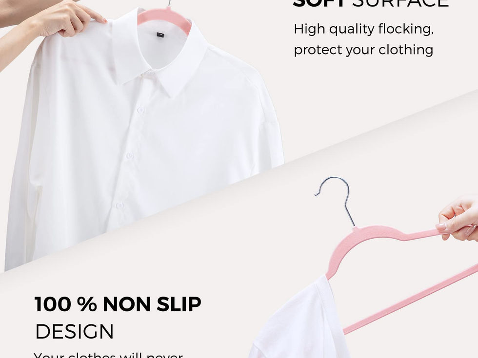 Ultra Thin Padded Velvet Hangers: Set of 100 velvet hangers measures 17.5 x 0.25 x 9.0 inches each; 360-degree rotate feature, The ultra-thin hanger is sleek yet strong enough for a heavy winter coat or suit jacket. The shape helps to maintain the integrity of your clothing Space Saving Hanger Design: Get rid of those bulky plastic hangers that take up space and stretch out your clothes. HOUSE DAY premium quality hangers allow you to organize your clothing to save space and ensures your clothing will last longer Soft Non Slip Velvet Hangers: Don't worry about your silk tops, dress shirts, pants, or dresses falling easily like they do on plastic hangers. Our soft velvet hangers provide a nonslip solution so your clothing stays in place on the hanger, not on the floor STRONG DURABLE SILVER HOOK: Our 360 swivel hook can hold up to 10 pounds so you don't have to worry about broken hangers. It turns 360 degrees so you can easily store clothing in the direction you need, keeping your closet organized and neat Quality Guarantee: HOUSE DAY is a brand specialized in most types of daily use hangers, marketing to both individuals and businesses in global markets. The advanced technology we used is able to provide you the most premium product quality