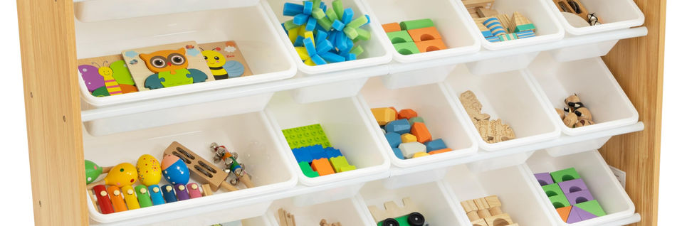 Super sized for 40% more storage than other toy organizers. Removable toy storage bins for playtime and easy clean up. Sturdy engineered wood construction frame reinforced with steel dowels, 20 pound weight capacity per level. 20 durable plastic storage bins, 16 standard and 4 large (equivalent to 8 standard bins) interchangeable storage bins. BPA and phthalate free. Product sizing— Organizer: 51”W x 11”D (16”D with stabilizing braces) x 32”H, Standard Size Bins: 12”L x 9”W x 6”H; Large Size Bins: 16”L x 12”W x 6”H