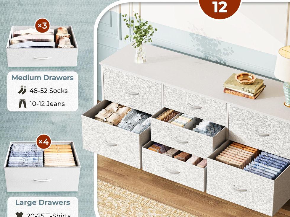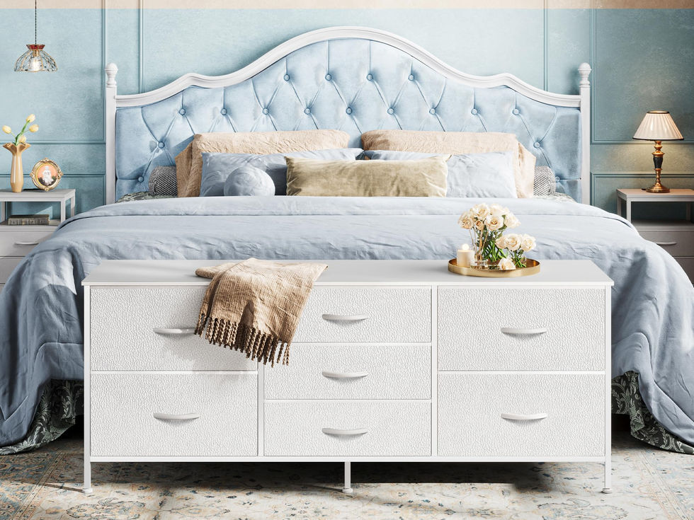 【7 Divided Storage Fabric Drawers】This dresser for bedroom features 4 large side fabric drawers and 3 medium middle fabric drawers, offering a perfect solution for organizing your clothes, beddings, and TV accessories. No more searching through piles of clutter, everything has its place 【TV Stand for 55 Inches】 With a 54-inch desktop, this bedroom dresser can be doubled as a TV stand with storage fabric drawers that fits screens up to 43/55/60 inches. Perfect for movie nights, you can enjoy your favorite films with everything neatly stored in the 7 drawers 【Multiple Usage】 Versatile and practical, this fabric drawer dresser is ideal for various rooms in your home. Use it in the bedroom closet for extra storage, in the hallway or in the living room as TV stand dresser for organizing media, in a college dorm, or for kids' nursery 【Various Styles】 Available in flexible colours to match any home decor, choose from dark grey, white, charcoal black wood grain print, and rustic brown. The anti-tip device and adjustable feet ensure stability, making this nursery dresser safe and sturdy for any room 【Easy Assembly】With a sturdy metal frame, extra stability from the rear lacing bar and easy-to-pull handles, this bedroom chest of drawers is built to last. Clear instructions, provided tools, and numbered parts make the assembly process quick and hassle-free