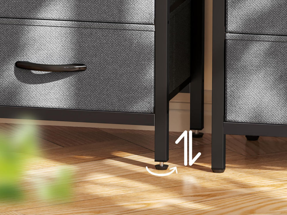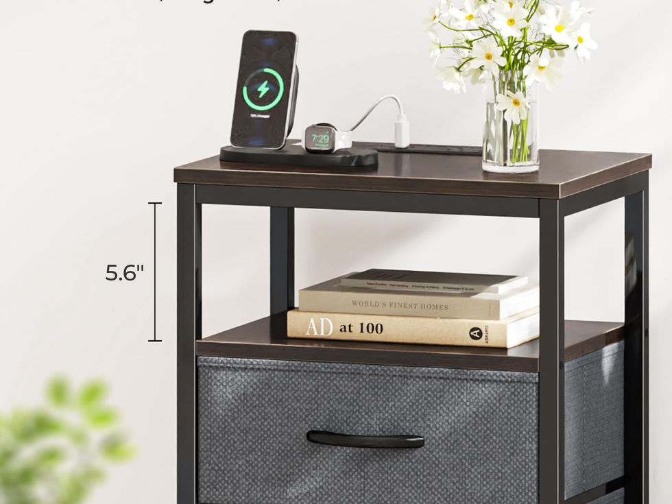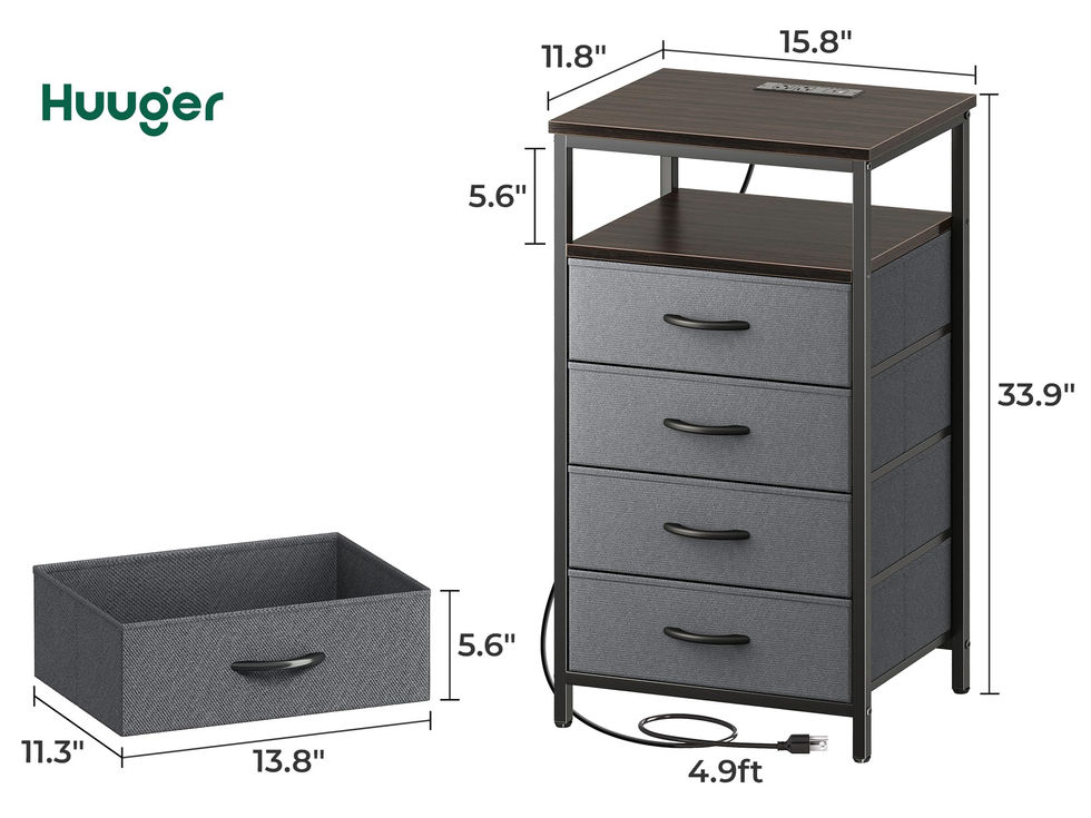 【Nightstand with Charger Station】More close charging spots, more handy uses. Equipped with 2 AC outlets, 1 USB port and 1 Type-C port on the tabletop, this fabric dresser allows you to effortlessly charge your devices or lamps overnight, ensuring you wake up worry-free with no low battery concerns. Plus: Contain patent pending drawer slide 【4 Storage Drawers】The bedroom dresser features 5 fabric drawers (13.8 X 11.3 X 5.6 Inch) for storing your books, light clothing, toys well. You can also put your books, decorations and lamps on the desktop. Collapsible, breathable and sturdy, these fabric drawers ensure your belongings are well-preserved. Please note: the drawer capacity is designed for smaller items and may not store large clothing pieces such as down jackets. 【Versatile Placement】This tall dresser utilizes vertical storage. Whether place it in your walk-in closet for growing clothes, set 2 in the entryway as a console cabinet, or in the living room, or bedroom for storage, this end storage table keeps your space clutter-free with style. This kid dresser is also a great addition to a child's room for organizing toys and essentials 【Sturdy and Safe】Crafted with particle board and a robust metal frame, this bedroom dresser with drawers ensures durability and longevity. Secure it to the wall with anti-tip device to prevent items from falling or protect kids when in use. Also, the adjustable feet ensure more stability on the floor and protect against floor scratches 【Quick and Easy Setup】With numbered components, included tools, and clear instructions, this closet storage organizer can be ready in no time, no need to waste your time on tedious assembly. This sleek nightstand with smooth lines and drawer will easily add state in your home space