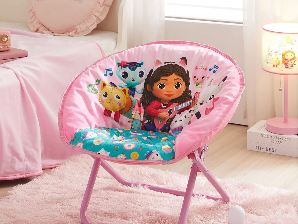 FUN DESIGN: Gabby's Dollhouse design featured on this toddler folding saucer chair will put a smile on your child or someone dear to yours face! Colorful, sturdy and the perfect chair for comfortable rest. The perfect gift for all the Gabby's Dollhouse fans. SOFT AND COMFORTABLE: This soft saucer chair is made of soft mink fabric with a cushioned polyester fill that is comfortable for your little one to sit in. Your little one will not want to get up once seated in this comfortable saucer chair. The perfect seating option for your little one featuring his or her favorite character. An exciting piece of furniture to add to your child’s home décor. SAFETY LOCK: Metal frame has safety locking mechanism to keep chair supportive and in place. Recommend spot clean only. FOLDABLE: This saucer chair is foldable and perfect to store away when not in use. It folds flat for easy, space-saving transport and storage. No assembly is required. DIMENSIONS: Saucer chair measures 17.3" L x 19.7" W x 18.9" H when open. Weight Capacity is 81 lbs. Lightweight and easy to transport around.