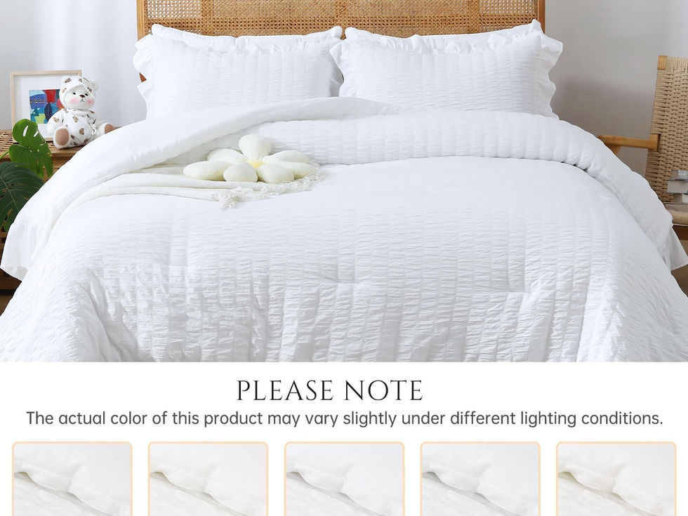 Seersucker Material: Our king comforter set is made of seersucker. The fabric is breathable 65% more than cotton. This means slightly airier and more lightweight, and more effective at moisture wicking, keeping you cool and dry throughout the night Stylish Ruffled Design: Our 3 piece comforter set king size features handmade ruffle edges. Choosing our ruffle edge comforter cover to decorate your room makes the entire bedding look more tasteful and fashionable and brings a luxurious feeling to the room Cationic-Dyed Technology: Our king bedding sets use cationic dyeing technology to give a more unique and innovative a PUearance than the usual normal dyeing, with no fading and more natural, long-lasting colors Easy To Care: Since the comforter is packed in a vacuum bag, it is highly recommended to leave the quilt in the sun to enjoy enough sunlight and pat it gently to make it fluffy. It can be machine washed separately in cold water on a gentle cycle. Please do not bleach. Tests have shown that after more than 100 washes, the comforter retains its shape and remains in new condition. No pilling, no shrinkage, no fading What You Can Get: Our king size comforter set includes everything you need for a cozy bed: 1 ruffle comforter (90"x 90"+4.5"), 2 ruffle pillow shams (20"x 26"+2.5")