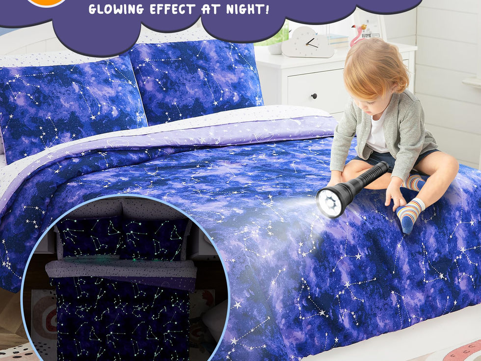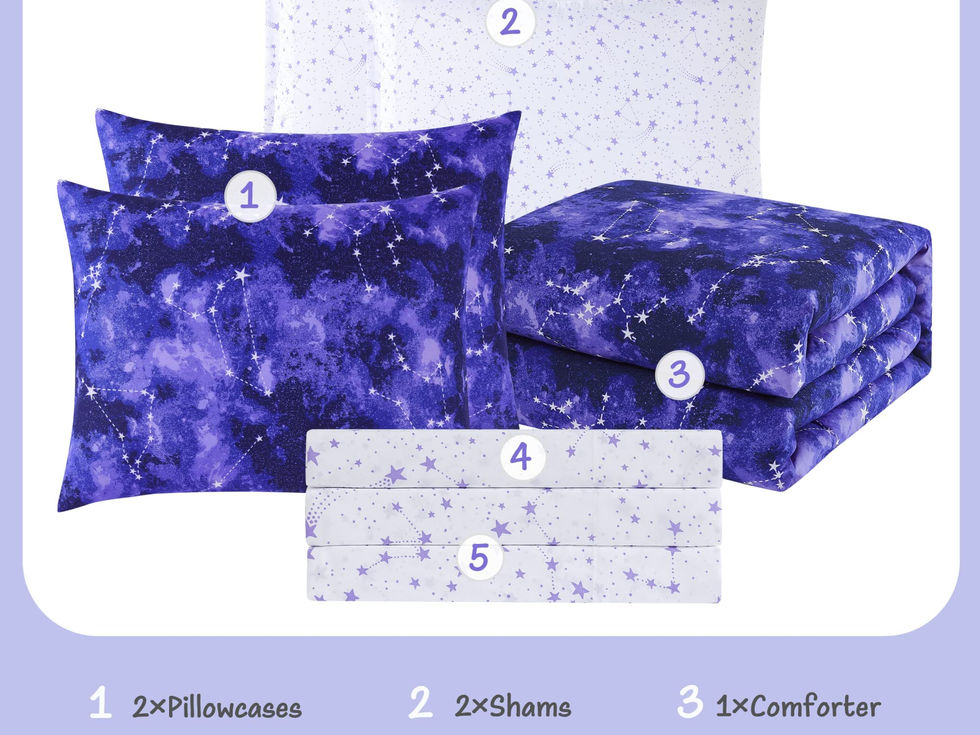 【Glow in the Dark Design】The stars pattern can glow in the dark, creating a marvellous sleeping environment for kids. The luminous comforter and shams enable kid to feel safer at night. This galaxy comforter set will be a wonderful idea for kids to decorate the bedrooms. 【Soft Material】This purple black kids comforter set is made from 100% premium microfiber. The 200gsm filling keeps our product breathable and lightweight, ensuring your kid to have a comfortable and deep sleep all night. The glowing part is also tested to be 100% harmless, please rest assured to buy. 【What You Get】Full size comforter sets includes: 1 comforter(76"x86") + 2 shams (20"x26") + 2 pillowcases (20"x30")+ 1 flat sheet (81"x96") + 1 fitted sheet(54"x75"+12"). 【Easy to Care】Machine washable in cold water separately, gentle cycle, tumble dry low, do not bleach or iron. 【Value Every Customers】We aim to provide great products and services to every customer. If you have any needs or questions about our galaxy bedding set , please contact us and we will provide you a satisfied solution timely.