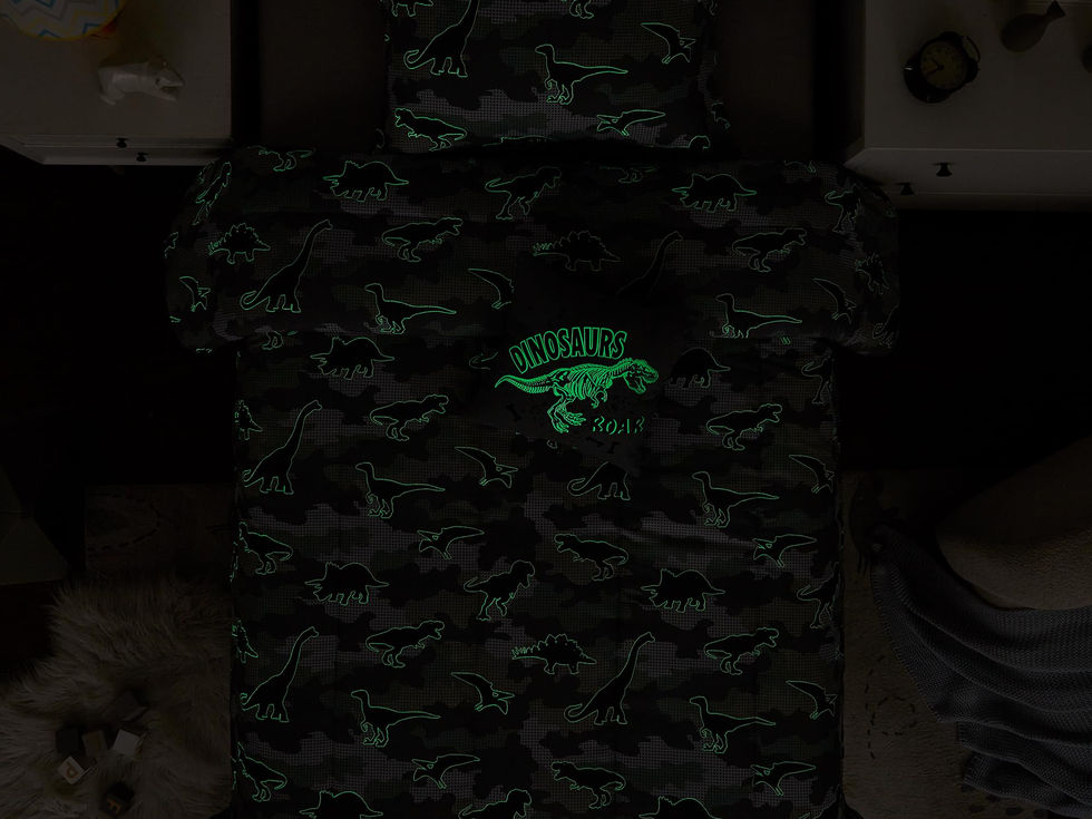 【Glow in the Dark Design】The cute dinosaur's pattern can glow in the dark, creating a marvelous sleeping environment for kids. The luminous comforter and sham enable kids to feel safer at night. This dinosaur bedding sets will be a wonderful idea for kids to decorate their bedding rooms. 【How To Glow & Soft Material】 For the pattern to glow-in-the-dark, expose to sunlight or LED light for 15 Mins. This kids comforter set is made from 100% premium microfiber, the 1700gsm filling keeps our product breathable and lightweight, ensuring your kid to have a comfortable and deep sleep all night. 【What You Get】Twin comforter set includes: 1 comforter(66"x86") + 1 sham (20"x26") + 1 Decoration pillow. 【Easy Care】Machine washable in cold water separately, gentle cycle, tumble dry low, do not bleach or iron. 【Value Every Customers】We aim to provide great products and services to every customer. If you have any need or question about our dinosaur bedding sets, pleas contact us and we will provide you with a satisfied solution timely.