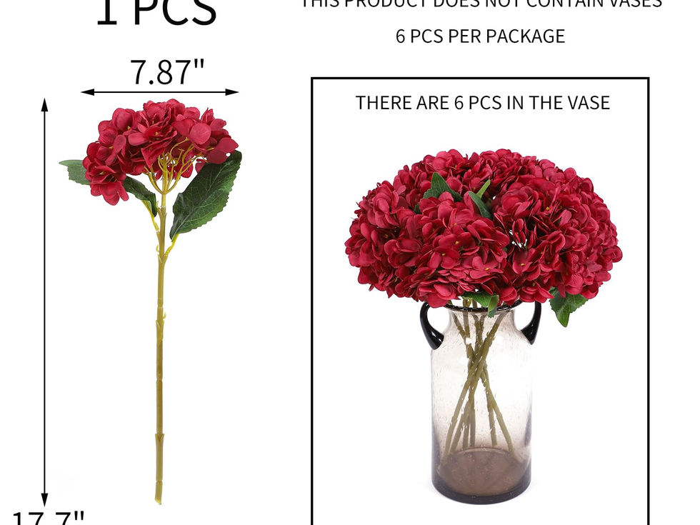 Size:Each flower has 96 petals,accompanied by 2 leaves,Height:45 cm/17.72inch,Diameter of the flower:20cm/7.87inch.Note: The priceof the product is 6 pcs. MATERIAL:The life of a real flower is short. Why not chose an alternative one. The artificial hydrangea flowers are made of silk and plastic, durable for years and remain vivid. and the stem was with steel wire internal. The stem can be cut or bend to adjust the length of flower as you needed, flexible and easy for flower arrangement. EASY TO CLEAN & SAVE: Unlike the real fresh hydrangea flowers, the flowers and leaves will not fall. It is easy to clean and can be conserved several years. If there is dust on the flowers, you can wipe it gently with a dry cloth, or you can wash it with water and then dry it with a clean cloth. Please be careful when wiping it to keep it lasting. Occasions:Large artificial hydrangea is natural realistic, plump and beautiful, which are suitable for any season or occasion. Perfect for weddings decor, parties, banquets, kitchens, dining rooms, tables, rooms, daily vase,offices, farmhouses garden, interior home decor or any other floral decoration. It also makes a great gift for someone who is allergic to pollen. Note: Please understand the difference of different colors, such as lighting, different computer monitors, and so on.silk hydrangea flowers may be squeezed out of shape during transport. Arrange them by hand after receiving the goods and let the bouquet unfold to restore their original shape. If you have any questions, please feel free to contact us. We believe that we will bring you a satisfactory shopping experience.