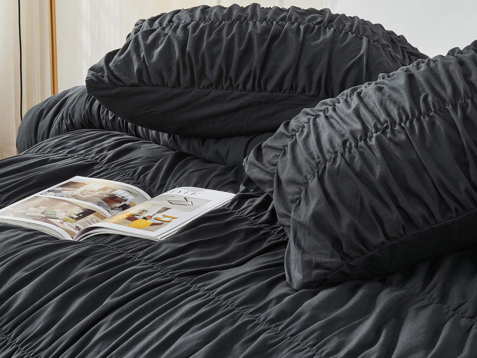 Design - Merging innovative abstraction with vintage artistry, our ruched ruffle comforter set offers versatility, year-round use and comfort of an ultra-fine fiber. Fabric - Exquisitely light yet rich in texture, tailored texture’s soft finish accentuates the luxurious touch of our shabby chic bedding set. Masterfully crafted with a lofty fill. What you Get - King size comforter (108 x 90”) with 2 standard pillow shams (20 x 36”). Petal-softness, Enveloping feel & Comfortable temperature for Sleeping. Easy Care - Machine washable (in COLD water), avoiding special heavy housework. Hang dry or Tumble dry in LOW. Professional Washing TEST approval, No shrinkage or fade, the boho comforter takes on a NEW look after Test. Warm Tips - Since the ruched comforter set is packaged in a Vacuum Bag, it is highly recommended to put it in the dryer on low heat to help take the wrinkles or put it in the sun and tap it gently to fluffy.