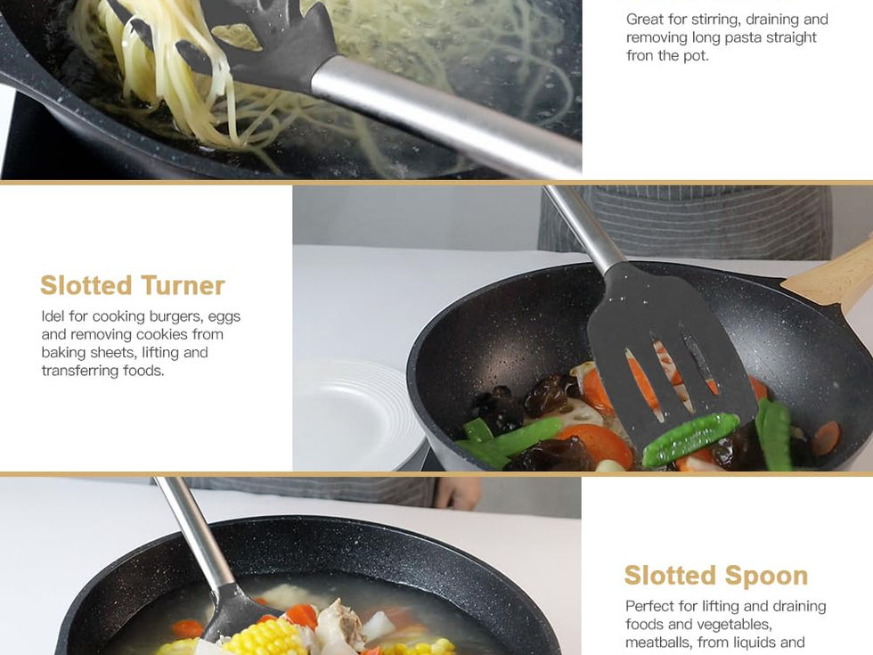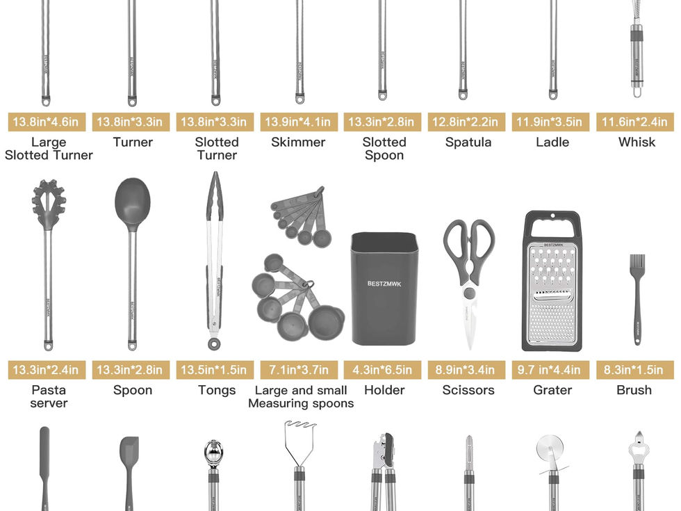 33 COOKING UTENSILS - Utensil Set includes everything you need to cook that perfect dish,includes Slotted Spatula ,Slotted Spoon,Flexible Spatula,Slotted Turner, Solid Turner, Pasta Server,Solid Spoon, Kitchen Tongs, Draining Spoon, Whisk ,Deep Soup Ladle,Spatulas,Brush,Peeler,Pizza Cutter,Bottle Opener,Potato,Pusher,Ice-cream spoon,Can opener,Grater,Scissors,measuring cups and spoons set,Small Brush,,Small spatula,Spatula,Holder LASTS A LIFETIME: The most durable utensils set in the market features thick handles designed using top-grade 304 stainless steel, and utensil heads made out of durable silicone. Even with daily use, they’re designed to not bend like plastic utensils, not break like wooden kitchen tools, and not rust like other metallic utensils. PROTECT YOUR EXPENSIVE PANS: The non-scratch silicone heads pair great with your expensive non-stick pans, pots and bakeware, ensuring that the cookware surface is not scratched or dented; they’re the perfect tools to extend the life of all your kitchen pans. NO PLASTIC WHATSOEVER: There is no trace of plastic in the entire construction. It’s also usable for an effortless clean, with the elegant design sprucing up your kitchen. This kitchen utensils set is to be completely free of BPA and latex. EASY TO CLEAN & STORE: Our heat resistant utensils are fast, simple and easy to clean. Simply toss these in the dishwasher to wash off any grease or oil in seconds and feature small holes on the handles to let you hang these to store them without taking much space.