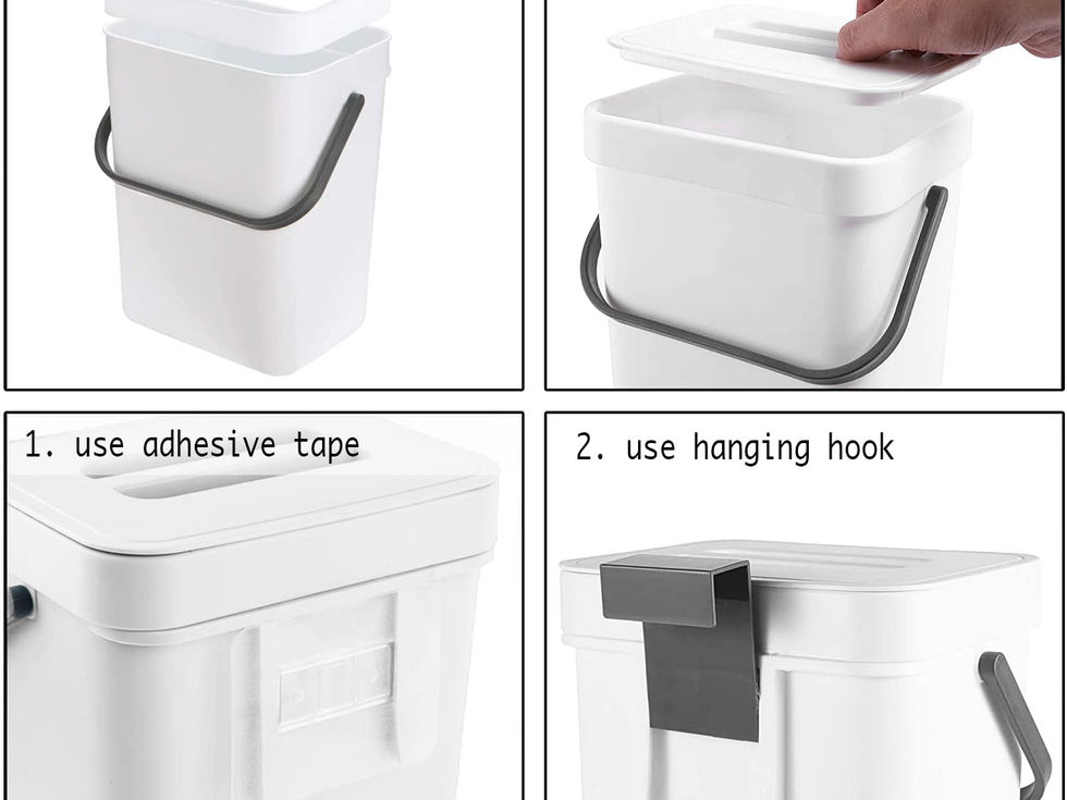 Odor-Blocking & Fruit Fly Free: Say goodbye to the smelly decomposing waste. Our compost bin for kitchen counter comes with a precisely-fit lid, you can let the scraps build up for several days without worrying about attracting fruit flies or terrible smells into your kitchen. Multi-purpose: This indoor compost bin can be put on the kitchen countertop; mounted on the wall in the kitchen/bathroom/laundry room with adhesive tape; hung over the cabinet doors, pantry doors, cupboard, under sink with over-the-door-hook. Convenient: Use this plastic compost bucket to store fruit scraps, vegetable peelings and other compostable materials for several days, and save your trips to your outdoor compost piles or bins. Compact Size: 1.3 Gallons / 5 Liter. 9.6” x 7.5” x 5.7”. The kitchen compost container with lid doesn't take up too much countertop space. Perfectly fits on a countertop, under the sink, or in the pantry. Dishwasher Safe & BPA Free: The compost pail is made of high-quality, BPA-free plastic that is stain and odor resistant, easy to wash. The retention ring of the comosting bin helps keep the garbage bags from sliding down.