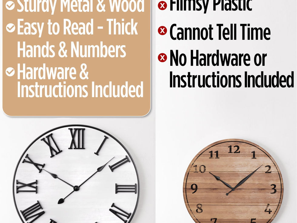 ACCURATELY & SILENTLY KEEPS TIME - With a noiseless quartz motor and sturdy hands, this Roman numeral wall clock reliably tells the correct time with NO TICKING! Requires 1 AA battery NOT INCLUDED. EXTRA LARGE WALL CLOCK - This 24 inch wall clock is designed to be displayed as a statement piece, and with chunky raised numbers and thick hands, the time is easy to read from afar. This decorative clock is perfect for your kitchen, living room, dining room, bedroom, entryway, office and MORE! REAL WOOD & METAL WALL CLOCK - This oversized wall clock has a sturdy black powder coated iron frame, white pinewood veneer clock face and black MDF Roman numerals. With a durable frame, strong and smooth wood face, and secured numbers, this analog clock is made from quality materials and designed to last. EASY TO HANG - INSTRUCTIONS & HARDWARE INCLUDED - This large farmhouse wall clock has a mounting hook and comes with a screw-in drywall anchor and screw. This large hanging wall clock arrives packaged securely and fully assembled ready to hang with easy-to-follow instructions. DECORATIVE & FUNCTIONAL - With its real wood pattern, this large decorative wall clock is timelessly stylish and will elevate your home décor, whether farmhouse or modern. This giant wall clock matches elegantly with other HB Design Co. products. Check out our store and complete your home!