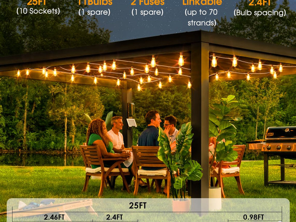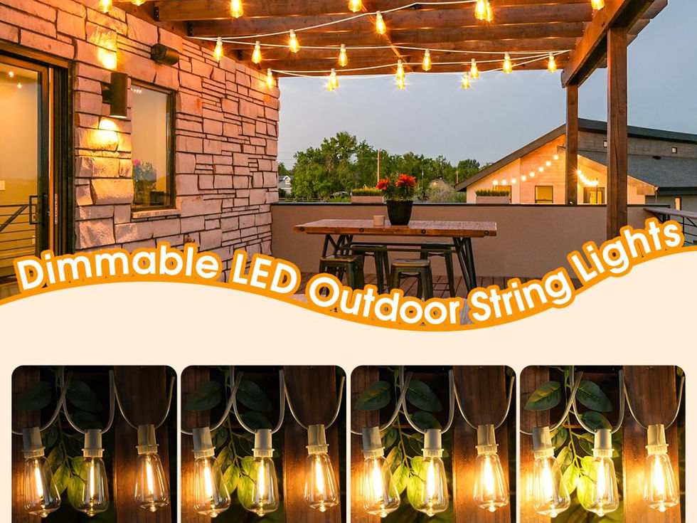 1. NOT solar powered! 2. Please tighten each bulb before use. If some bulbs don't light up, try wrenching the copper inside the socket out a little bit so that the copper makes good contact with the bulb. 3. Our lights are compatible with standard dimmers, not compatible with smart dimmers. Dimmer and remote are not included White Cord 25 FT 10 Bulbs Dimmable ST38 Outdoor Hanging Lights: Transform your outdoor space and create a warm, inviting atmosphere with our 25 ft 10+1 ST38 tear-drop shaped clear bulb string lights. These light is white cord, provides a clean and elegant look, making it easy to complement any outdoor decor. Emits a 2700K warm glow to illuminate your patio. Compatible with standard dimmers to create a customized and personalized outdoor lighting ambiance IP65 Weatherproof & Shatterproof Edison String Lights: Our led shatterproof bulbs are IP65 high-rated waterproof to withstand heavy rain, humidity, heat and windy weather. Safer to use than glass bulbs without worrying about glass shards. We crafted with durability for enhancing your outdoor decor, you can confidently leave the lights outside without having to remove it to bring it inside, they will hold up well even with the rain. Please tighten each bulb before use Low Voltage & Energy-saving: Our white cord retro ST38 edison light bulbs are low-voltage design and cost-effective, 1W per bulb, consumes less energy than high-voltage incandescent string lights. Long-lasting 30,000+ hours lifespan reduces maintenance costs and reduces bulb replacement. This light string generates low heat, is safe to touch, the bulbs are flicker free and friendly to the eyes of your family and friends Easy to Install & Connectable & Portable: The hooks built into each bulb socket are perfect for hanging with hooks, zip ties, guildwires and nails. Easy to Install just in minutes, not as heavy as commercial-grade style wiring lights, our lights are lightweight and easy to untangled and hang, won't sag easily. Our 25 ft string light can be connected up to 70 strands to hang to cover a large space. You can transform any outdoor space into a cozy and inviting area for gathering and party