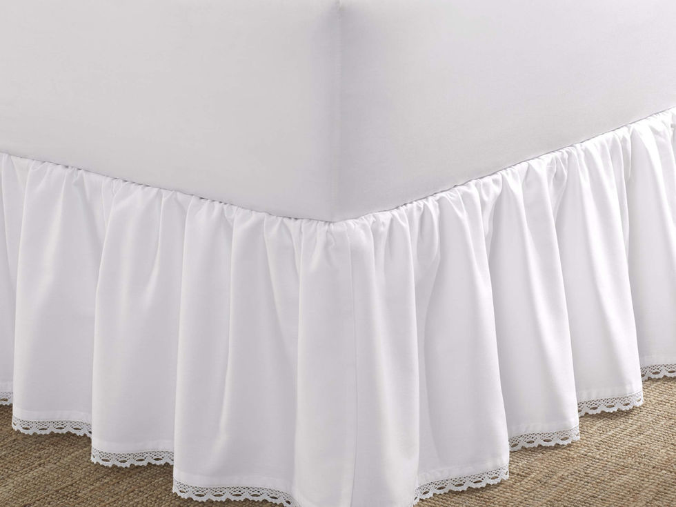 INCLUDES:(1) king bedskirt MATERIAL: 100% Sateen Cotton FEATURES: 220 thread count bedskirt with a delicate croceheted trim and a 15" drop DIMENSIONS: 80" x 78" CARE INSTRUCTIONS: Machine washable for easy care. Machine wash cold, separately. Delicate cycle. Tumble dry low. Do not bleach