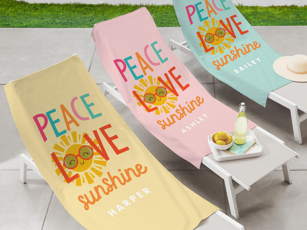 COOL BY THE POOL: Let the groovy vibes begin! Add some fun to any beach or swimming pool adventure with this beach towel featuring the cool trio of peace, love and sunshine. UNIQUELY PERSONALIZED: That's my towel! Choose from a variety of designs and customize each towel with any name. A BEACH NECESSITY: Along with sunscreen and flip flops, the perfect towel is a must-have for any warm-weather outing. Whether you're putting your toes in the sand or lounging by the pool, this towel will make you smile all summer long! PREMIUM QUALITY: This towel takes fun in the sun to another level. It's made from a super-soft cotton/poly blend and is machine washable. Imported for final manufacture locally. A GIFT FOR ALL SEASONS: Wrap it up! A thoughtful gift for your favorite beachgoer or water lover, this towel is a great choice for birthdays, vacations, family reunions, spring break, or just because!