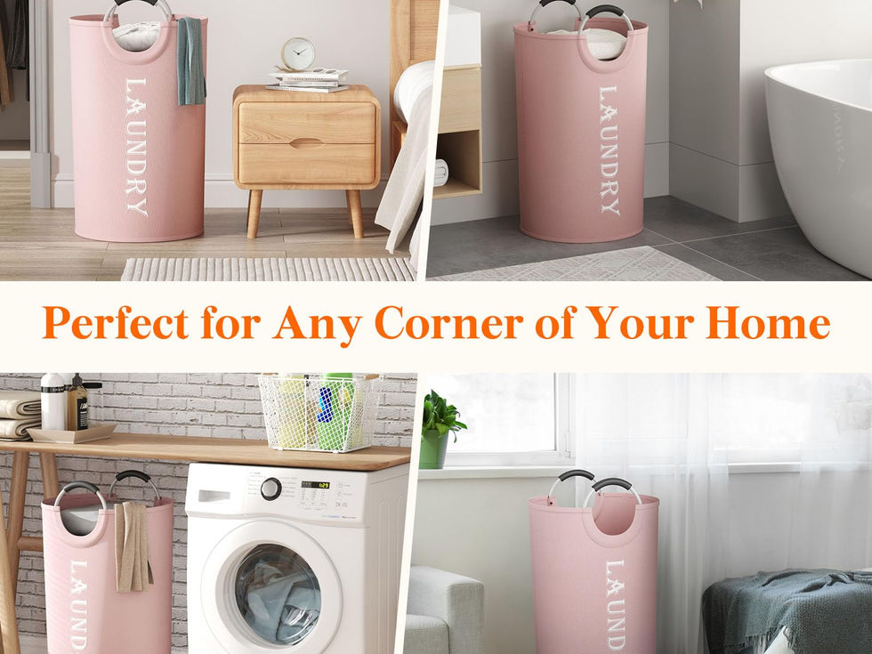 Large Capacity: This scientifically enhanced laundry basket now measures 17.3" x 17.3" x 31.1", offering an expanded 120L capacity. It comfortably accommodates 2.5 loads of laundry while also providing storage space for quilts, blankets, dolls, books, and more, effectively maximizing space and maintaining a tidy home. Aluminum Soft Handle: The dirty clothes hamper features a sturdy and comfortable aluminum soft handle for effortless carrying and hand protection. Whether it’s a full load or not, you won’t feel weighed down. Take it anywhere in your home with ease, such as the laundry room, bedroom, or bathroom Stands Tall yet Folds Small: This laundry hamper with handles stands upright even when empty, making it convenient for filling. It can also be folded and stored in a small, portable size to save space when not in use Premium Material: The laundry hamper is made of high-density 604D Oxford fabric, which is sturdy and resistant to damage. The interior features a waterproof EVA coating that keeps clothes fresh and dry. Cleaning is easy - just wipe it with a damp cloth Stylish and Practical: This laundry bag with a “LAUNDRY” print design is suitable for any age group and can be used in various areas of the home. It offers efficient storage and can be placed in the bathroom, bedroom, living room, laundry room, playroom, dorm, and more