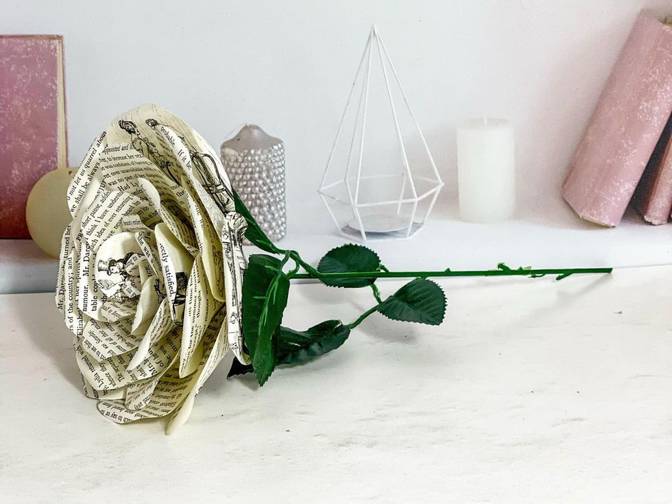 Crafted From Upcycled Literary Classics: Experience the refined beauty of our Pride and Prejudice Book Page Paper Flowers. This exquisite 3D paper flower is skillfully crafted from the recycled pages of damaged Jane Austen novels, making a sustainable and creative gift for the eco conscious book lover. Expect a charming variety of text and classic imagery, as each handcrafted rose is truly one of a kind! Eco-Friendly Elegance: Embrace sustainability with our handmade gifts crafted from salvaged books to prevent waste. This 3d paper rose captures the spirit of conservation, offering an environmentally conscious choice for decorations or gifts without sacrificing the classic beauty of 3D paper art. Available in 3 sizes: small (approx. 3" across) medium (approx 5" across) large (approx. 6 inches across). Versatile Celebratory Gift: Whether it's to mark an anniversary, a graduation, or to just say ""I cherish you,"" our handmade paper roses are the perfect present. Their timeless beauty and literary roots make them ideal gifts for English majors, actors, teachers, or any book lover in your life. Durable & Timeless: Unlike traditional flowers, our gifts for book lovers last forever. These handcrafted paper roses won't wilt, ensuring that your gift is not only a unique piece of art but also a lasting keepsake that can be enjoyed for years to come. Artisan Craftsmanship: Each paper flower is a testament to skilled artisanship. Handmade with care by a mother-daughter team in the USA, every petal and leaf is attentively shaped to create a stunning 3D effect that breathes life into cherished words, offering a unique and sophisticated gift option that stands out from the ordinary.