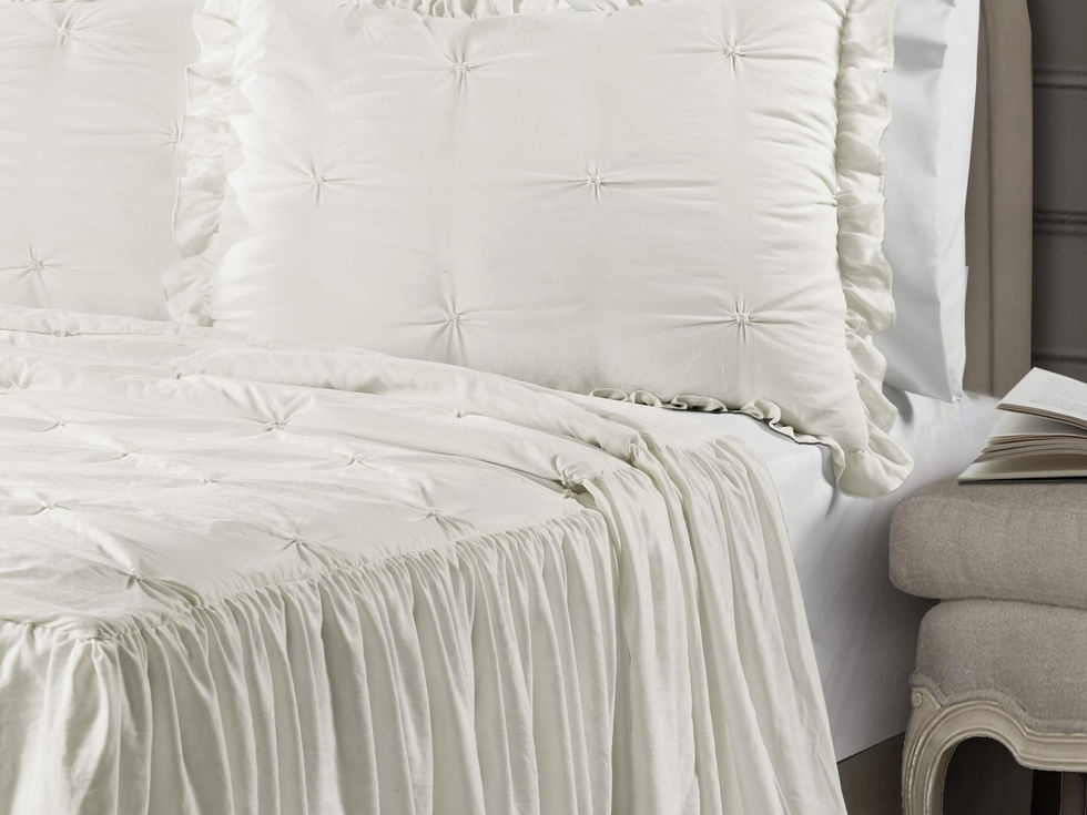 Luxe Bedding: Add a touch of romantic charm to your bedroom decor with our Ravello Pintuck Ruffle Skirt Bedspread Set. With the solid colors, luxe pintuck detailing, and generous size, this bedding has a beautiful overhang look for a more glamorous feel. Charming Decor: This bedspread set also adds a feminine touch to your space. The cascading ruffles drape downward to the floor giving your bedroom an airy yet dramatic look. Available in a neutral white hue to elevate your bedroom decor. Chic Design: Layers of pintuck detailing give this crinkled microfiber bedding a timeless, textured look. This polyfilled bedspread is lightweight, perfect for a hot sleeper or great as an additional layer for those cold sleepers who want to stay warm. Complete Bedding Set: Our 3 piece king ruffle skirt bedspread set includes 1 bedspread: 76" W x 80" L + 30" drop and 2 king pillow shams: 36" W x 20" L + 2" ruffle. Machine wash cold gentle cycle and tumble dry low follow care instructions. Buy with confidence. This bedding set is STANDARD 100 by OEKO-TEX certified, which means the fabric, dyes and all components have been tested in an independent laboratory and certified against a list of more than 350 harmful substances.