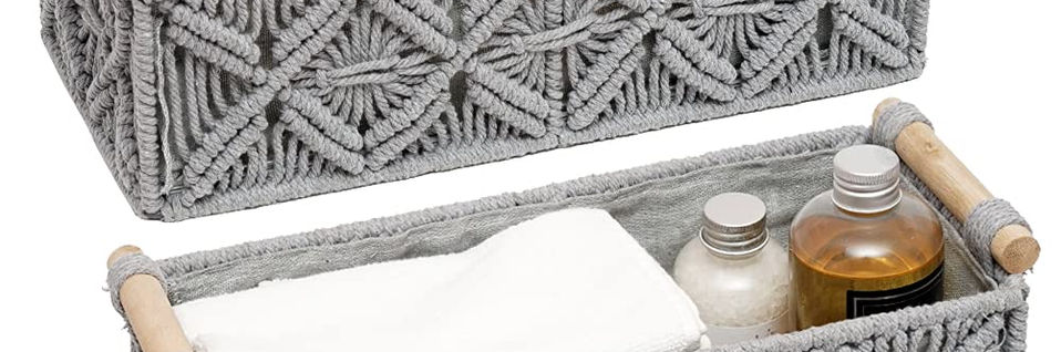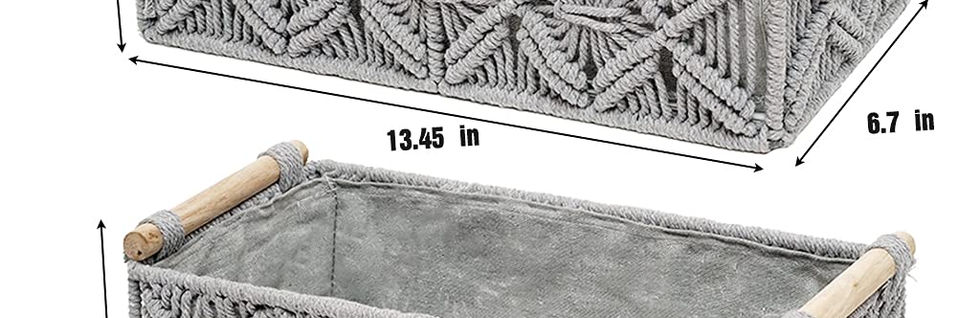 1.Great Handmade Storage Basket:This storage bins is all handmade with cotton rope custom.Each knot takes our workers a long time to weave.So it's a perfect gift that is completely handmade. 2.Creative gifts:When you don't know what to give as a gift,it will be a great idea.It can be a gift basket for you friends or family.Your friends or family will absolutely love this creative gift.It will be the perfect finishing touch to your home. 3.Multiple-use Storage cubes:This storage basket not only can be used in your bathroom it also can be used in living room, guest room, kitchen, office etc.All the miscellaneous things in daily life can be used for storage use this basket. 4.Prefect Boho decor for your home:This basket is full of bohemian style.It will perfectly match the bohemian home decor.The combination of cotton rope and wood is warm and elegant.Practical and aesthetic at the same time. 5.Product size:13.4*6.7*3.9inche,11.8*5.5*3.5inche.Prefect for anywhere of your house or office.