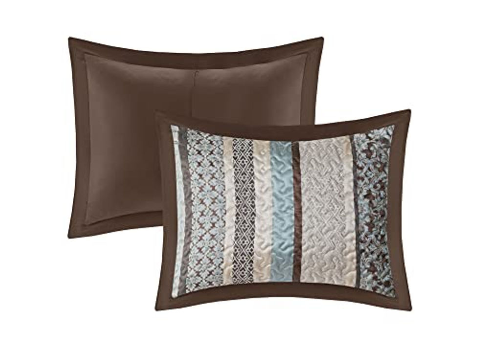 Add a touch of richness to your home decor with the Madison Park Princeton 5 Piece jacquard bedspread set. Princeton creates character with intricate geometric and damask prints in a mix of grey, ivory, and soft blue tones with solid chocolate brown border. Enjoy the soft microfiber polyester that is an ultra-fine fiber, lightweight and durable fabric for all season comfort. Set include: 1 Bedspread: 120"W x 118"L, 2 King Shams: 20"W x 36"L + 2"D, 1 Decorative Pillow: 18"W x 18"L, 1 Decorative Pillow : 6.5"D x 18"L Care Instrcution: Machine Washable. Spot Clean Pillows