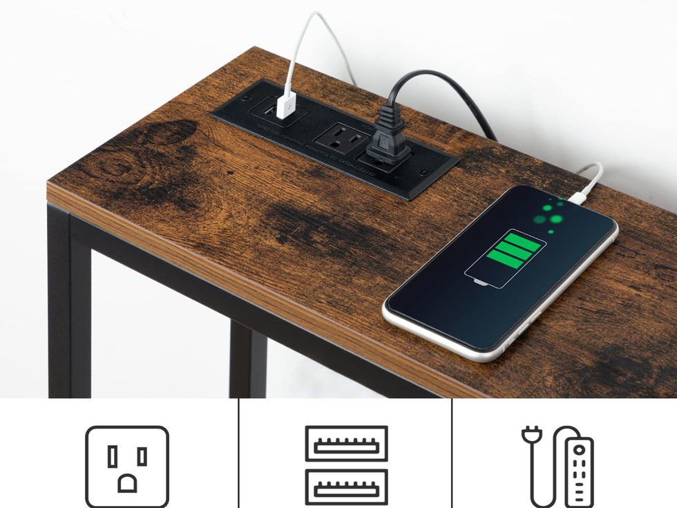 Sofa Table with Power Strip: The console table comes with built-in 2 plug outlets, 2 USB ports and a 59’’ power cord. The table top panel can be rotated, you can choose to place the power strip on the side or in the middle of the table as needed. With all the functions required for charging, the sofa table is ideal for your mobile phone, laptop, lamps and other electronic devices Multi-Purpose Console Table: The narrow furniture works perfectly as a console table, sofa table, entry table, or even a nightstand. With its retro and elegant features, the entryway table is suitable for your living room, bedroom, dining room, study, foyer, office, hallway, etc. Long Lasting Use: The quality P2 particleboard and sturdy metal frame work together to provide high load-bearing capacity (the top holds up to 220 lb). Adjustable feet and anti-tipping device are included to ensure stability and protect floors from scratches Great for Tight Spaces: With a size of 63"L x 7.9"W x 31.7"H, the slim and compact console table fits easily into any smaller spaces like apartments, dorms, and more. It is the perfect storage solution for tight spaces Easy to Assemble and Clean: We provide you with numbered accessories, detailed instructions and necessary assembly tools to help you assemble this entryway table without hassle! The high-quality tabletop can be easily cleaned with just a damp cloth!