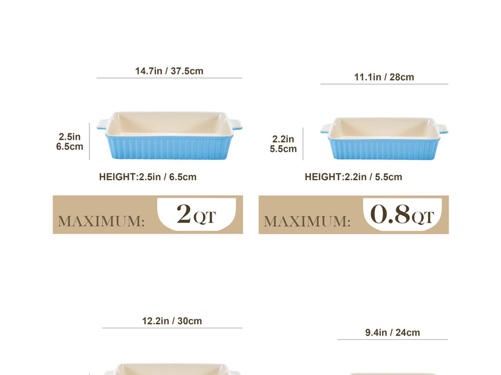 【MADE OF DURABLE PORCELAIN】A type of premium LEAD-FREE and NON-TOXIC ceramic that is anti-chip, scratch resistant, bright surface, and easy to clean and maintain, longer service life. Safe for dishwashers, refrigerators, microwaves, and ovens. Get the most out of your investment with our MALACASA Casserole Dishes. 【4 SIZES TO MEET ALL NEEDS】(Including handles size) ① 14.7"L x 8.4"W x 2.5"H, 3QT ② 12.2"L x 7.1"W x 2.4"H, 2QT ③ 11.1"L x 6.5"W x 2.2"H, 1.5QT ④ 9.4"L x 5.2"W x 2"H, 0.8QT. This oven bakeware set can meet all your needs in the kitchen, from individual servings to large family meals, you can effortlessly find the perfect size. 【TEXTURED DESIGN】The rectangular baking dish with convenient handles makes it easier for you to pick it up from the oven or freezer. Also, nice color, smooth surface, and fluent lines guarantee that these baking dishes remain timeless in style! 【EASY TO CLEAN & GIFTABLE】Interior and exterior glaze protect baking pans against stains, making them easy to clean by dishwasher or hand. This ceramic bakeware set is perfect as a gift for your friends and family on Housewarming, Birthday, Wedding parties, Mothers' Day, Fathers' Day, Christmas, and New Year's Day. 【12-MONTH WARRANTY & CUSTOMER SERVICE】Your purchase is guaranteed by our 12-month warranty against manufacturer defects. Our customer service team is always ready to assist you with any inquiries or concerns you may have. Experience worry-free shopping with us today! :)
