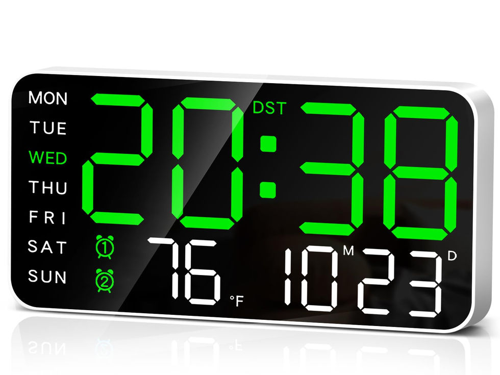 9.5-inch Large LED Display:Width: 8.46 inches. Height: 4.33 inches. It has a 9.5" large screen. Allow you to read clearly from any angles, far distance. Especially user friendly for the elderly. It's also a nice decorative stuff for your room Dual Alarms Setting&Snooze Function :If you have a different time schedule,you can set two separate alarms. When the alarm rings,long press any button about 5s to turn off alarm,enter the next alarm state. Short press any button to start snooze and you can get 5 minutes of extra sleep. It also allows you to set weekday mode, which will ring only on Monday to Friday or Saturday Automatic Daylight Saving Time and Auto/Manual Brightness: Seamlessly adjust to daylight saving time with a long press of the "-" button. Choose from 5 brightness levels using the remote control for personalized comfort, while the built-in automatic dimming sensor intelligently adapts to ambient lighting changes Multi-functional Placement:The back of the wall clock has 2 hanging holes, which can be used for fixing on the wall, and comes with a 78-inch power cord. You can also directly place the digital alarm clock on the desktop for use.This wall clocks is suitable for living Two Power Mode: If you want to keep the screen always on,It must work with 5V/1A power adapter (no included) and 11.5 feet cable cord (included), When wall clock only 3 AAA battery(no included) is used for power supply, without key operation automatically turns off the screen within10s,and you can activate the display by make some noise like rapping on the table or rapping on the clock