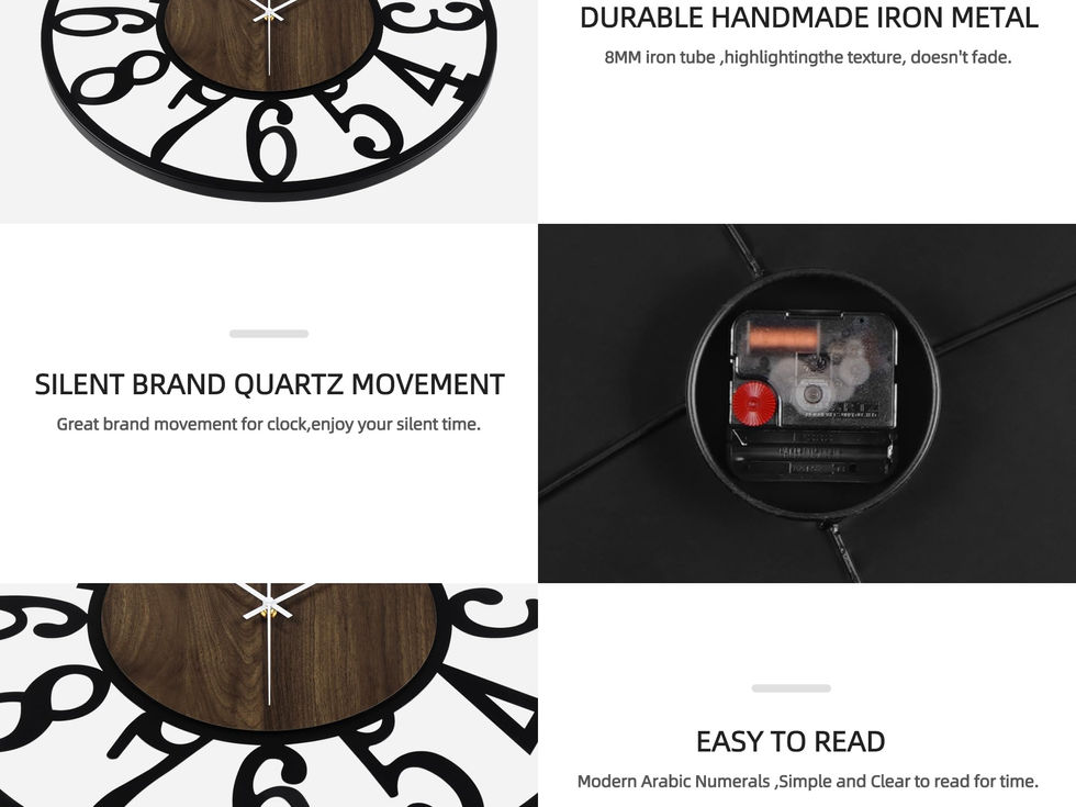 Modern Design:wall clock is designed with a combination of black walnut color wood veneer and black Arabic numerals. It is suitable for most American style and modern decoration, perfect to decorate your house. Arabic Numeral Design:combines a thickened iron outer ring with bold hollowed out Arabic numerals, allowing you to see the time more quickly and clearly. Silent Movement Clock: uses an upgraded version of the silent movement, which is more energy-saving. The movement does not make a ticking sound and is very quiet. It will not disturb you when you are working, studying or sleeping. Easy to Install: The wall clock requires 1 AA carbon battery to power (battery is not included in the product). The package includes the hooks you need. Just nail the hooks where you need and hang the wall clock. Widely Used:the wall clock is suitable for installation in the living room, dining room, kitchen, bedroom, conference room, studio, study room, outdoor or other public spaces. This wall clock is very practical and decorative.