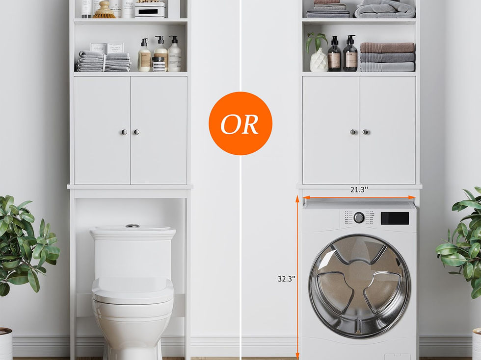 HIGH-QUALITY:This over the toilet storage cabinet is made of high-quality CARB P2-compliant wood, painted in a waterproof and moisture-proof process, in order to make your room neat and the cabinet sturdy for years AMPLE STORAGE: This over the toilet rack features 2 open shelves and 1 cabinet with doors. An adjustable shelf inside the cabinet can accommodate items of different height. Many bathroom supplies can be organized in the cabinet to keep your room tidy SPACE SAVER: The overall size of the storage cabinet above toilet is 23.6"(W) x 9.1"(D) x 74.8"(H), suitable for most standard-height toilets with 32.3" height from the bottom board to the floor.3 classic colors available: white, gray and black MULTI-FUNCTIONAL: The bathroom storage organizer is also suitable for small washing machines. Please check the size before purchasing. There is an anti-toppling fitting, which can secure the shelf to the wall for safety and stability EASY ASSEMBLY: All parts, accessories and a product installation manual will be delivered into one package. Follow the instruction, this storage organizer over toilet will be easy to install.If there is any question, please feel free to tell us