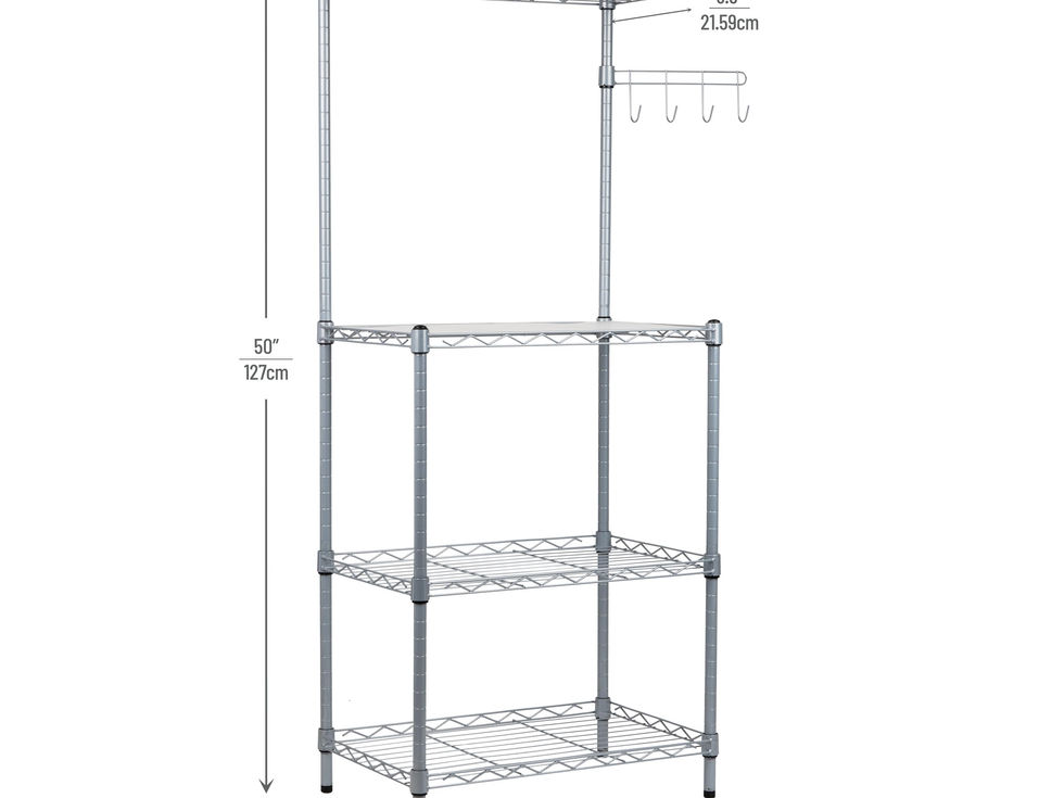 Sleek and Modern Design: The chrome plated metal construction offers a modern look that blends into your kitchen or butler's pantry. Its clean lines and sleek finish add a touch of elegance to your space while keeping it organized Maximize Counter Space: With three tiers of storage, this stand allows you to vertically organize your small kitchen appliances, plates, baking items, and more. Free up valuable counter space and keep your kitchen tidy and clutter-free Sturdy and Reliable: The wire mesh shelves of this stand are designed to hold up to 30 lbs (13.6 kg) each, providing a strong and stable platform for your items. You can trust that your appliances and other items will be securely supported Durable and Easy to Clean: Built for daily use, this stand is made from durable materials that can withstand the demands of a busy kitchen. Cleaning is a breeze - simply wipe it down with a soft cloth and mild soap to keep it looking pristine Optimal Dimensions: This 3-tier microwave stand measures 21.25 inches (54 cm) long by 13.5 inches (34.3 cm) wide by 49.5 inches (126 cm) tall. Its compact size allows it to fit seamlessly into your kitchen without taking up excessive space