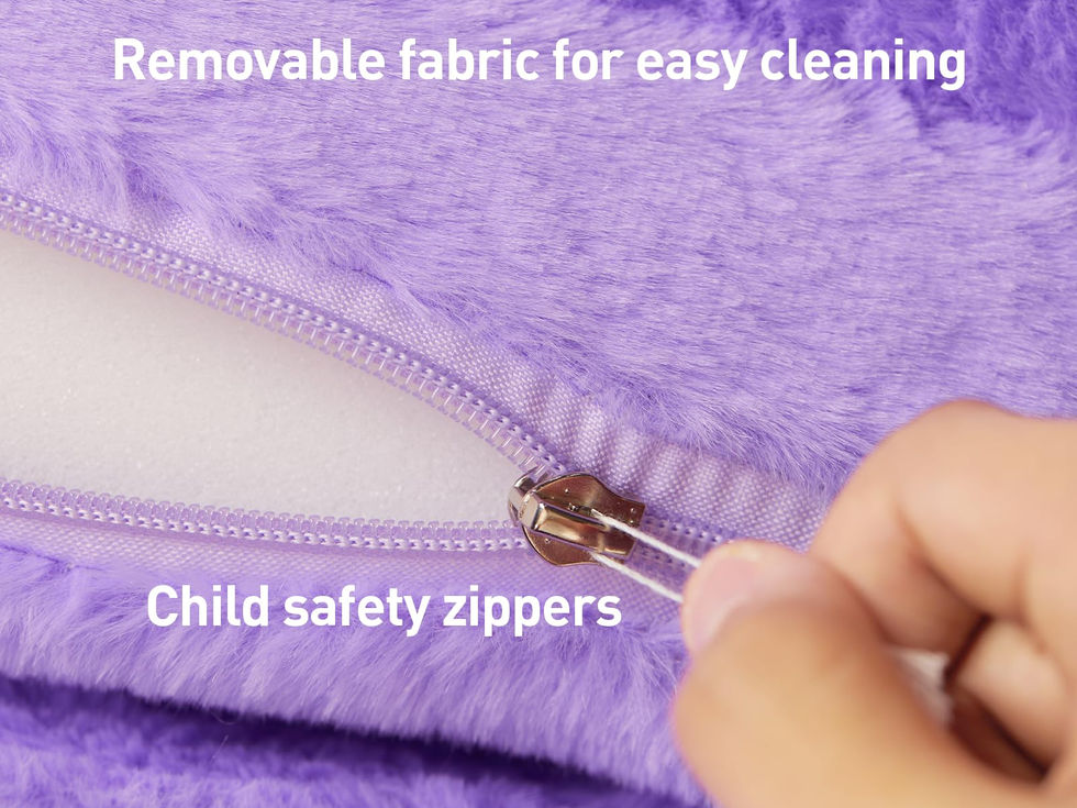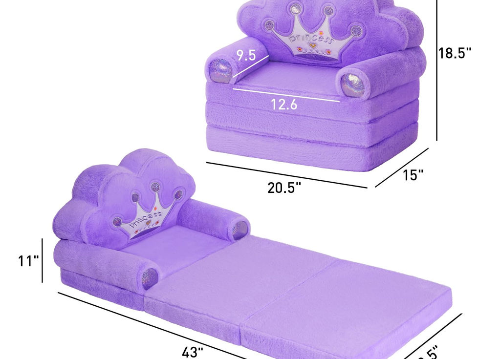 BABY FLIP OUT SOFA: The children's chair can be folded in your favorite shape; not only is it a kids sofa; but also can be used as a toddler couch bed; so that your little one can enjoy the playtime ABOUT SIZE: Folded size is 20 x 18 x 15 inches; Unfolded size is 43 x 20 x 11 inches; there is no hard frame inside the sofa; kids can easily take it to play anywhere ABOUT FABRIC: The fabric of the sofa is made of imitation rabbit fur fabric; which is soft and breathable; The sofa's crown look and sparkling embroidery design will be a hit with your little girl COMFY TODDLER CHAIR: Children's chairs filled with high-density and high elasticity foam; good support and elasticity; durable; retains its original shape after many uses WHAT YOU GET: A joyful family time.MONNBEEKI floor sofa is perfect for cozying up on for family game nights or morning cartoons; You can put it in the kids room; toddler playtime corner; living room and kindergarten to add childishness to your space
