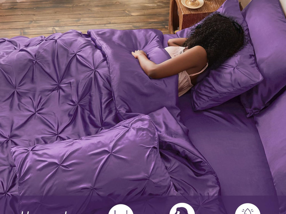Everything You Need: This big 7 piece full bedding set includes 1 comforter (82"x 86"), 1 fitted sheet (54"x 75"+ 15"), 1 flat sheet (81"x 96"), 2 pillowcases (20"x 30") and 2 pillow shams (20"x 26"). Soft Silky Satin: Few things say superior quality like genuine soft silky satin. Made of ultra-soft satin fiber that keep breathable for all seasons. Our satin is much more durable than cotton for years of enjoyment and attractive service. Comforter is filled with down alternative microfiber that creates a fluffy, cloud like experience. Get this for a restful full night's sleep. Skin and Hair are Refreshed: The high-quality satin fabric is silky smooth, keeping skin hydrated while reducing the appearance of wrinkles over time. The satin finish also keeps hair silky and shiny by reducing friction and pulling and preventing tangles and drying. The complete satin comforter set provides all-round care for hydrated skin and beautiful hair while you sleep. Luxurious Pinch Pleat Comforter Set: Stylish trendy Pinch Pleat design for an elegant look that instantly transforms your bedroom with European sensibility. Delicate pinches paired with classic color schemes combine beauty and function to make your bed comfortable and inviting. Machine Washable: This set is easy to care for with no special treatment needed. Simply machine washes the set in cold water separately on a gentle cycle and tumble dry or air dry. Do not bleach. If you have any concerns or questions, please contact us and we will resolve the issue as soon as possible.