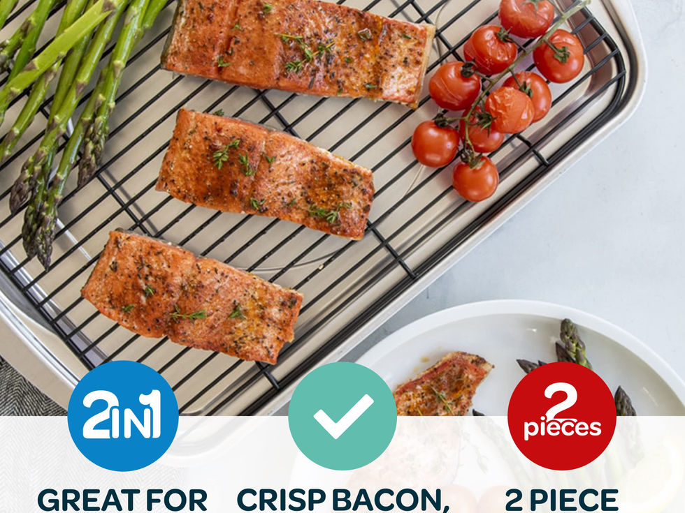 Great for making bacon, jerky, dried fruits, crisp fries, veggies and more Catches drippings or a healthier option and hot air circulates underneath so there's no need for turning Formed aluminum pan with nonstick coated steel rack Easy clean up, hand wash only Made in the USA with rack from China