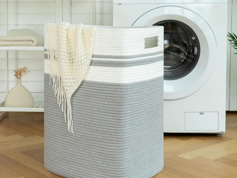 Natural Handmade Laundry Baskets : OIAHOMY high quality laundry hamper is made of cotton, natural and healthy.In addition,this cotton rope basket is no sharp edges and a hard surface, safe for kids, elders,pets in nursery,baby room,play room,bedroom,living room.This storage basket is Nature Material, No Chemical No Nasty No Disgusting Smell,Safe for Intimate Clothing Oversized Size Blanket Basket : The overall size of the storage basket is 15.7x15x23.62 inches.This large basket can easily accommodate a family's change of clothes and keep room clean & tidy.This elegant woven storage basket bring great convenience in life to store bulky items like blankets,toys,comforters,duvets,throw pillows,cushions,stuffed animals,winter clothing etc Double reinforced Handles : We use the highest grade cotton rope as raw material and all the stitches are distribution and fine,which makes the baskets better wear resistance and durability to be used for many years.In addition,each large basket features thick,double stitching around the handles to prevent ripping and keep its shape,never fall off Portable Collapsible & Large Soft Hamper : Our storage basket are soft to touch, yet sturdy enough to keep shape and stand up on its own. Even when subjected to the roughest toddler play, you’ll never have to worry about the laundry hamper leaving scuff marks or dings! Generously-sized handles with reinforced stitching allow for convenient and comfortable carrying of heavy loads around the house.They are collapsible,can be easily stored when not in use or when you travel Satisfaction & Note : We have invested a lot of love and effort in designing and manufacturing the best laundry baskets for our customers, so we support our quality and craftsmanship. If you are not satisfied for any reason, please let us know and we will replace your shopping basket for free or a full . NOTE: The laundry hamper is folded, but it will turn back to its elegant shape quickly if you fill it with some towels or blankets, and iron is great idea to remove the creases