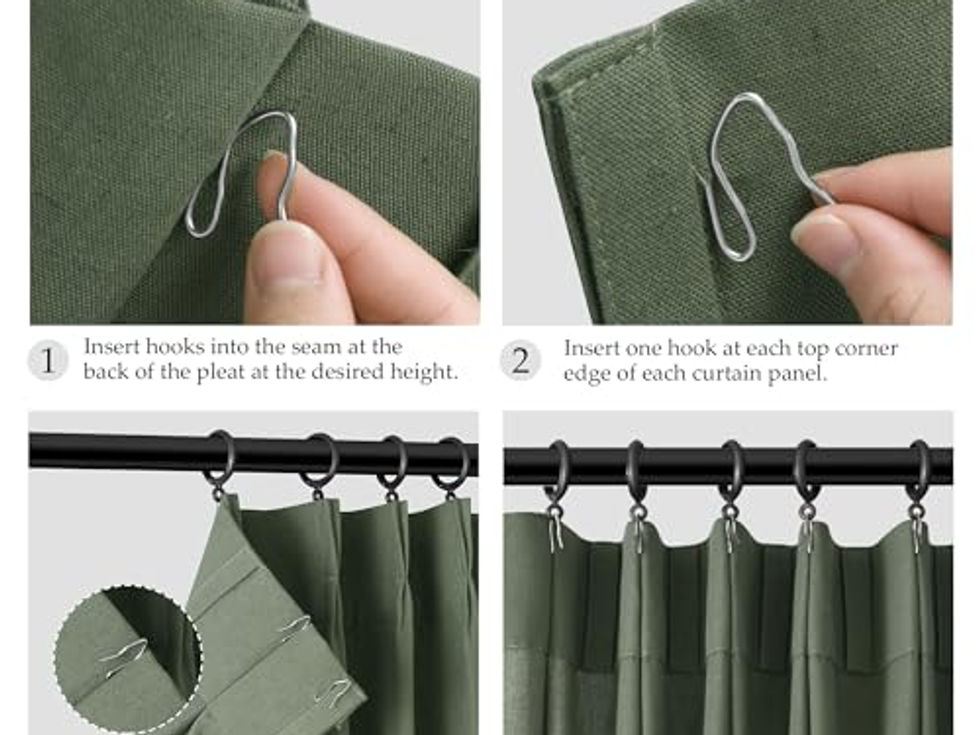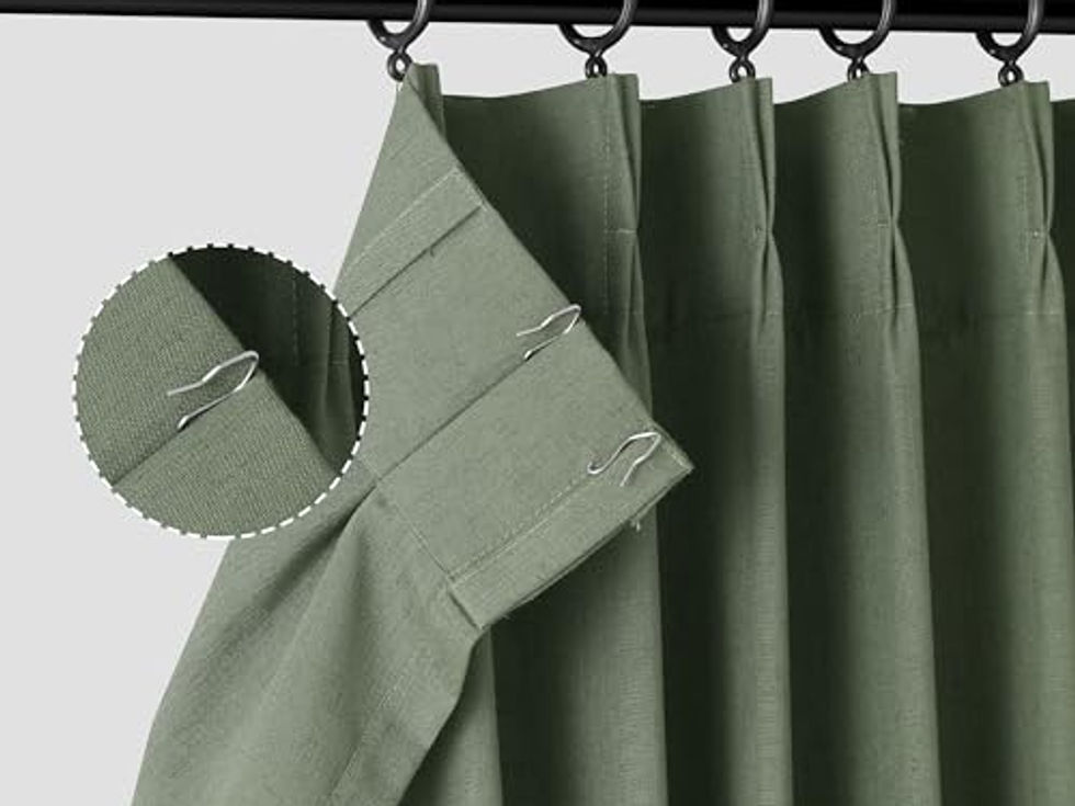 Pinch Pleat Design: Pinch pleated curtains use more fabric than regular curtains, creating a luxury curtain with elegant folds. Each panel has 7 pinch pleats, which bring a touch of sophistication. Hanging Aersas pinch pleated linen curtains flow in harmony throughout your home, helping you to create nurturing spaces that feel soothing and calm Upgraded Linen Fabric: Our olive green linen curtains are crafted from upgraded natural linen and imported polyester blended fabric, which possesses more flax linen fibers than other normal linen curtains. Richer linen texture brings a delicate look and a natural cozy feeling. The poly-linen combination is a more cost-effective option, with greater durability and wrinkle resistance Light Filtering and Privacy: These pinch pleated linen curtains feature an open weave that filters glare and harsh light, and upgraded thicker linen fabric (180GSM) provides a degree of privacy. While allowing natural light in, the semi sheer drapery obscures the view from outside, ensuring that you can enjoy your space without sacrificing your privacy Versatile Hanging Options: There are 3 hanging methods to choose from to meet your different home decorating needs. Method 1: Hanging with our hooks on poles or track to easy slide and creat a modern pleated effect. Method 2: Using back tab to hide the rod, easy to hang and showcase an elegant pleated look. Method 3: Using clip rings for easy, slide open and closed.(clip rings are not included). Install according to your preference Ready made and easy care: 2 panels per package, each panel measures 40 inches wide and 72 inches long with 20 hooks. Simply wash in cold water, tumble dry on low, and iron on the lowest setting if needed.
