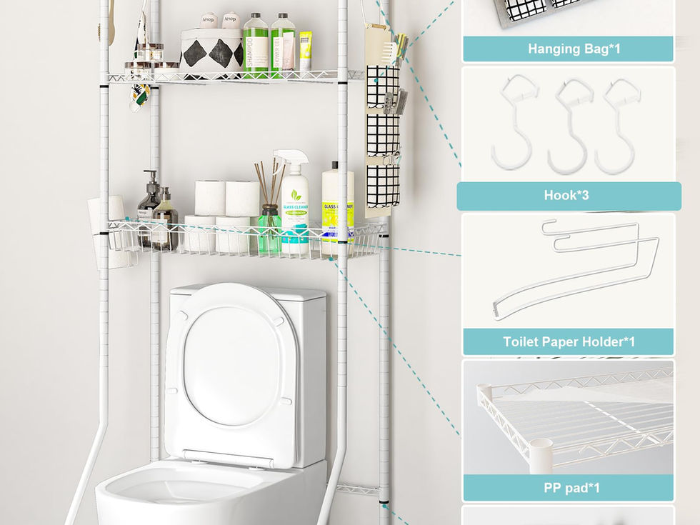 [Adaptable Shelf Heights] Customize the storage with adjustable shelves and basket-shelf providing ample storage for toiletries and other essentials, is perfect for storing items of varying heights and sizes, catering to your unique storage need.Meanwhile,The adjustable bottom shelf of this bathroom organizer ensures no toilet lid trouble, while the adjustable bottom bars fit a variety of toilet designs. [EASY ASSEMBLY] No tools required, easy to assemble and disassemble,come with a clear instructions and labeled parts, you can easily assemble this storage shelf to add extra storage space in your bathroom. [stability and durability] The thickened steel pipe and sleeve connection design make the shelf very stable and not rickety,Widening lower foot design greatly increases stability and durability, euqipped with four adjustable foot make the toilet shelf maintain stable on the uneven floor, You can also use the equipped wall anchor set devices to fix the toilet shelf if needed. [Free your space]Toilet rack size of 26" L*8.6" W*64" H,Two shelving and basket-shelf with guardrail design and equipped with PP pad,provide enough space to store bath essentials, like towels, toilet paper, shampoo,comestic and soaps etc..effectively uses the limited vertical space above the toilet,Say goodbye to the messy washbasin countertop,An excellent choice for bathroom storage, an excellent choice for bathroom storage. [multiple accessoriess]comes with hooks, roll racks, hanging bags, pp pad and other practical small accessories, providing convenient storage space for your toilet paper and small items. The pp pad prevents your small items falls through the holes.