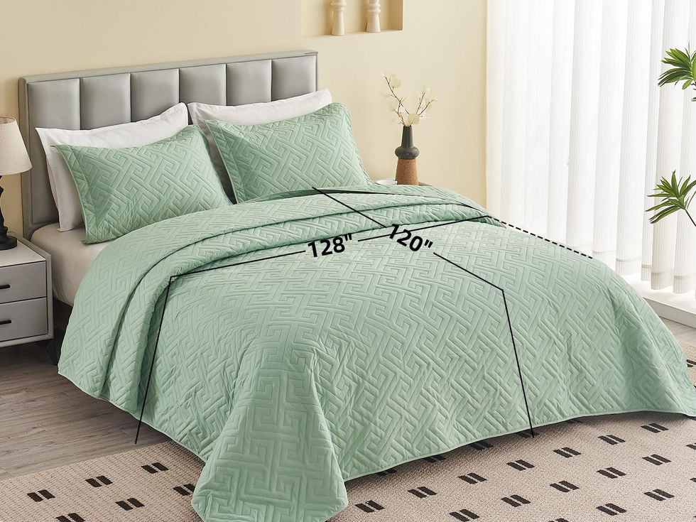 Generous Size - Perfect for split king adjustable bed or extra wide/high cal king or king size bed with thick mattress or pillow top. The oversized Quilt will reaches or almost reaches the floor on both sides and the end of the bed, even no need for a dust ruffle or bed skirt. Classic Decoration - Gorgeous pattern brings elegant look for making up the bed. Reversible with the same pattern and color on both sides. It is a perfect choice to decorate the master or guest room with this stylish Quilt set. Soft and Lightweight - Highest quality brushed microfiber is soft and gentle to the skin for long lasting comfort. With ultrasonic quilted technology, there is no thread stitching on the surface, it will not unravel and allows for many years of continued use. Multi-Purpose Usage - This oversized king Quilt is designed for year-round use. As a coverlet quilt for spring and summer, a Quilt or blanket in autumn and winter. Easy Care - Machine washable in cold water. Tumble dry on low heat. Do not bleach or iron. The Quilt comes in compact package, so it might be wrinkled after taking it out. Washing will remove most of them.