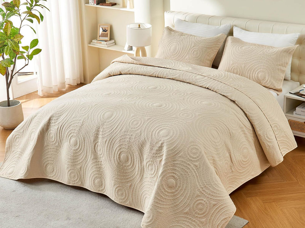 Generous Size - Perfect for split king adjustable bed or high cal king or king size bed with thick mattress or pillow top. The oversized quilt set will reaches or almost reaches the floor on both sides and the end of the bed, even no need for a dust ruffle or bed skirt. Multi-Purpose Usage - Include 1 x 128x120 bedspread and 2 x 20x36 pillow shams for king size pillow. This oversized king quilt set is designed for year-round use. Soft and Lightweight - Highest quality brushed microfiber is soft and gentle to the skin for long lasting comfort. With ultrasonic quilted technology, there is no thread stitching on the surface, it will not unravel and allows for many years of continued use. Classic Decoration - Gorgeous pattern brings elegant look for making up the bed. Reversible with the same pattern and color on both sides. It is a perfect choice to decorate the master or guest room with it Easy Care - Machine washable in cold water. Tumble dry on low heat. Do not bleach or iron. The quilt set comes in compact package, so it might be wrinkled after taking it out. Washing will remove most of them.