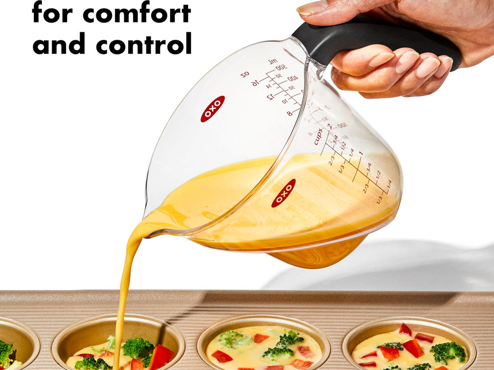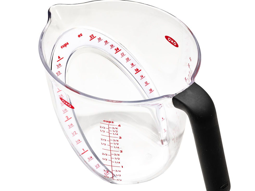 Patented angled surface allows measurements to be read from above Eliminates the need to fill, check and adjust Cup, ounce and milliliter measurement markings Soft, comfortable, non-slip handle Cup made of BPA-free and food-safe Tritan Renew, which is made from certified recycled content through a mass balance allocation process that transforms plastics destined for landfills into high-performance, food-safe materials