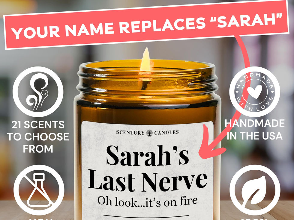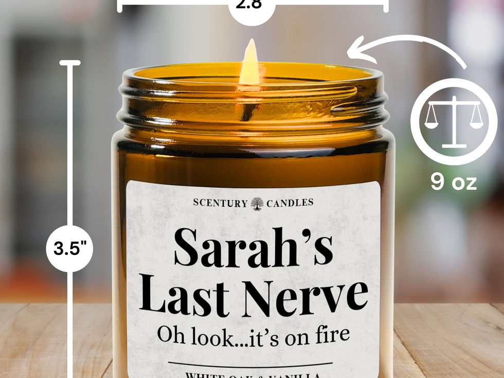 ๐ PERSONALIZED LAST NERVE CANDLE: A Funny Gift Idea For: Birthday Gifts For Women, Gifts For Him, Gifts For Friends, Personalized Gifts, Funny Gifts, Gag Gifts, Coworker Gifts For Women, Funny Candles For Women, Coach Gifts, Funny Candles For Men, Custom Candle, Sarcastic Gifts For Women, Funny Birthday Candles, Personalized Candle, My Last Nerve Candle ๐ซง HIGHLY SCENTED: Our Fragrances Are Professionally Blended And Enhanced With All Natural Essential Oils To Create Great Scented Candles. All Of Our Soy Candles Are Phthalate Free, Paraben Free, Non-Toxic, Dye Free, Gluten Free, And Pet Safe To Ensure A Safe And Beautifully Scented Atmosphere In Your Home. ๐ฏ๏ธ 21 SCENTS TO CHOOSE FROM: Scent Descriptions In Photos - English Garden, Fraser Fir, Cotton & Iris, Peppermint & Eucalyptus, Lavender, Citrus Sunshine, Sugared Cranberry, Palo Santo & Sandalwood, Red Currant, Macintosh Apple, Butterscotch & Bourbon, Velvet Vanilla, Banana Nut Bread, Apples & Maple Bourbon, Lush Linen, Spiced Honey & Tonka, Iced Gingersnap, Pumpkin Spice Buttercream, Peach Mango, White Oak & Vanilla, Coffee Shop ๐ฟ CLEAN BURNING: Our Candles Burn Evenly And Clean. Our Focus Is On Quality Not Quantity, And We Offer A Wide Variety Of Amazing Scents To Choose From. Try Us Out To See The Difference, We Appreciate Your Support Of Small Businesses Like Ours. ๐บ๐ธ OUR MISSION: At Scentury Candles Our Mission Is To Produce The Highest Quality Candles And Wax Melts Possible, And Are Handmade In Our Own Shop Right Here In The USA With Love. All Of Our Products Are Proudly Made Using Only The Highest Quality American Made Ingredients Available. We Use 100% Non-Toxic Soy Wax, A Perfect Blend Of Phalate Free Fragrance Oils And Essential Oils, And Lead Free Cotton Wicks To Ensure A Safe And Beautifully Scented Atmosphere In Your Home.