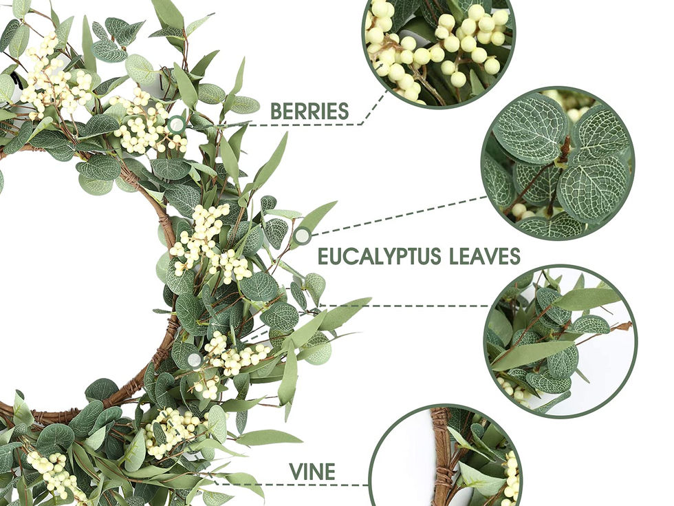 【Lifelike】: This eucalyptus wreath is made of 3 types of leaves with different colors, and it is additionally dotted with white berries, which makes it look more vibrant, Lifelike, and it doesn't take a lot of energy to manage. It keeps blooming and never fade. But to prevent discoloration, please try to avoid being in a humid environment for a long time. 【Durable】: The eucalyptus leaves are silk so they never fall, the berries are foam so they never rot. Do not need water and special cleaning.Could be used for a long time. 【Size】: Fully expanded door wreath, the inner diameter is about 25cm/10 inches, outer diameter is about 50cm/20 inches. To prevent the wreath from being damaged during transportation, the wreath decoration is tightened. You can adjust as needed to get the best look. 【Widely Used】: The wreaths for front door could be used in all seasons, you can add decorations elements to it, such as green leaves, etc. When you design it by yourself, you will find that your wreath is the most unique scenery. It is also suitable as wedding wreath, welcome wreath etc. Of course it's also suit for sitting room, hotel, wedding scene, wedding car, villa and wall decoration, photography background etc. This Green wreath will bring an enjoyable ambiance all year round. 【Guarantee】: All our spring wreaths for front door are guaranteed by quality. Because the wreath is handmade, the size will vary slightly. If there are any problems with our products, please 【contact us】 at the first time, we will definitely give a perfect answer.