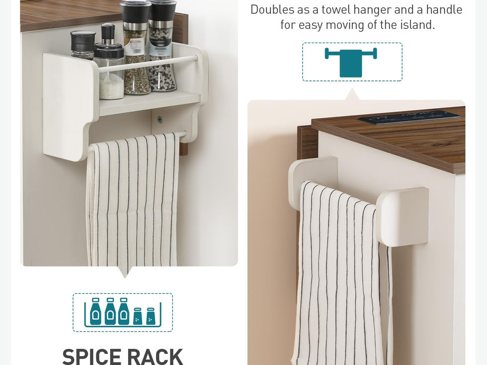 Modern Elegance: The clever fusion of white and walnut hues creates a chic and inviting vibe. The sliding barn door brings a modern flair, while the mesh design offers a open, airy touch. Carefully crafted, the kitchen Island mirrors your tasteful home decor Extending Drop-Leaf: The island features a extendable countertop. It doubles the space when fully extended, perfect for accommodating multiple diners with bar stools as a cozy coffee nook. When folded, it tucks away neatly to free up space effortlessly Convenient Power Access: With a 4.9-foot long power cord, 2 AC outlets and 2 USB-A ports, the kitchen island offers a hassle-free charging solution for your coffee maker, microwave, toaster, and other kitchen appliances, boosting cooking efficiency with ease Ample Storage: The kitchen island has 3 drawers for organized storage of utensils and cookware, a spice rack with guards and a towel bar on the sides. The bottom cabinet with adjustable shelves meets your diverse storage needs to declutter your kitchen Movable Island: The kitchen cart rolls on five industrial-grade swivel casters, one in the center for balance. These wheels are built for heavy loads and quiet, smooth movement. With two of them locking, it's easy to secure the cart in place when needed